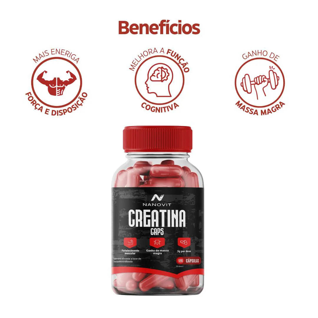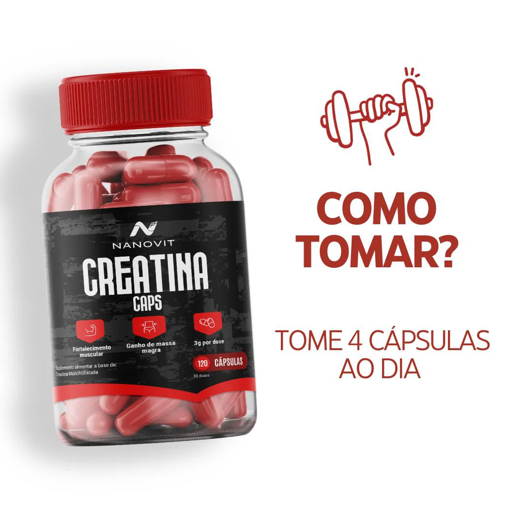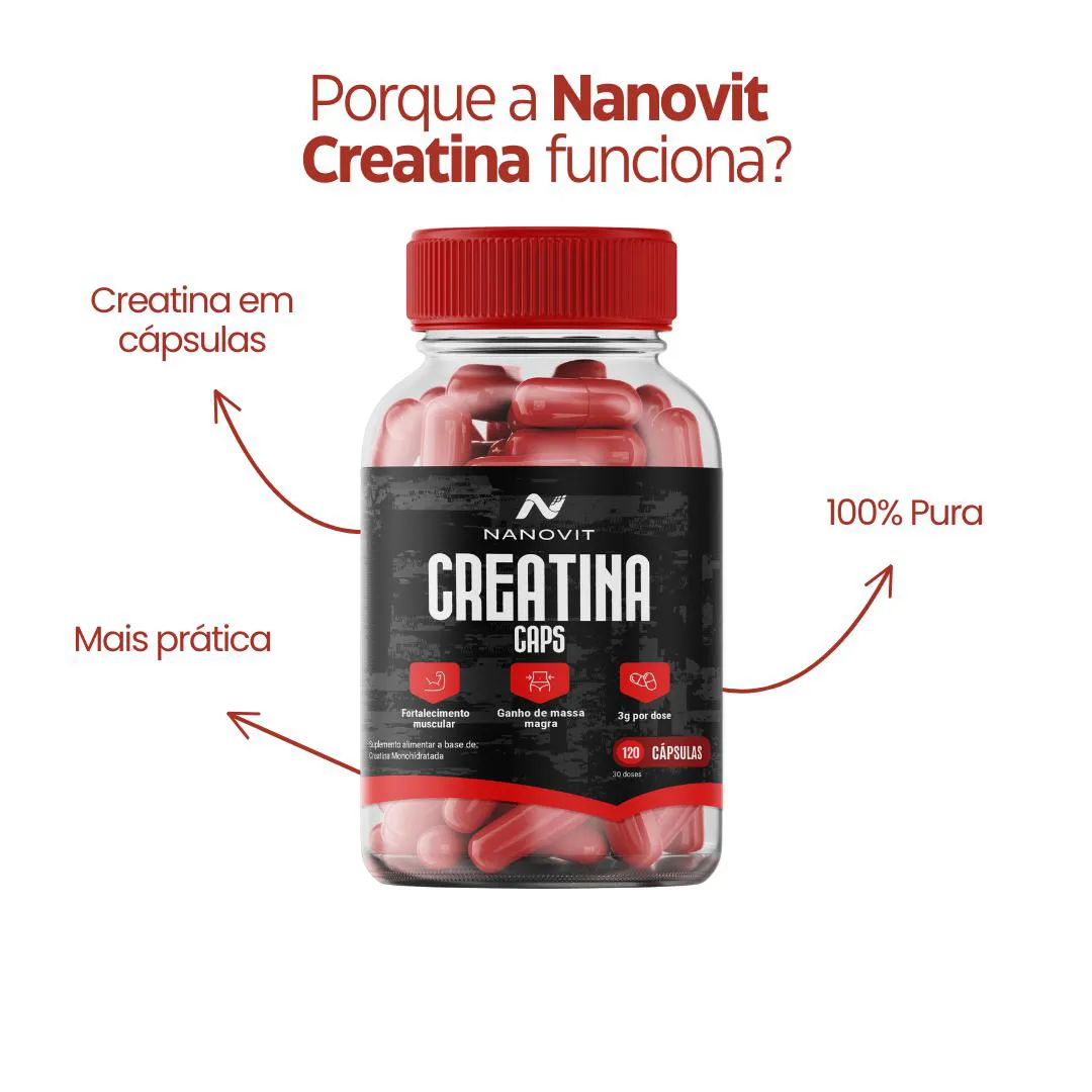 creatina Monohidratada 100% Pura 120 Cápsulas – Nanovit A creatina é um composto natural encontrado no corpo humano, principalmente nos músculos, e pode ser obtida através da alimentação (carnes e peixes) ou suplementação. Diferenciais: · Praticidade da cápsula. · 100% pura. · Produto 100% Natural e direto da fábrica para sua casa. Ação de cada nutriente: A creatina é fonte poderosa de produção de energia, traz força e disposição, tem efeito anti-inflamatório, retarda o envelhecimento muscular, grande aliada no ganho de massa magra e na recuperação em qualquer atividade física. Como Usar: · Concentração de Creatina é de 750mg por cápsula, e a ingestão diária recomendada é de 4 cápsulas (3g de creatina). · Pode ser consumido a qualquer hora do dia, de acordo com sua rotina. Consistência é o mais importante. Recomendações: · Manter fora do alcance de crianças e seguir a dose diária recomendada. · Orientamos sempre que gestantes, lactantes ou pessoas com doenças crônicas, procurem orientação de profissional da saúde para uso de qualquer suplementação. · Consumir junto com alimentos para facilitar sua assimilação. Conservação: · Armazenar em local seco e fresco, ao abrigo da luz. · Consumir em até 30 dias após aberto. Nanovit Nutrition A Nanovit é uma marca com mais de 20 anos de experiência no desenvolvimento e fabricação de suplementos e vitaminas 100% naturais e integrativas. Reconhecida pela abordagem abrangente, tem como pilar o diferencial no desenvolvimento de produtos completos, que preenchem as lacunas nutricionais necessárias para o pleno funcionamento do nosso corpo, com transparência e matérias primas de qualidade e importadas. Todos os nossos produtos são exclusivos, com fabricação própria, registrados e homologados pela ANVISA. Aviso legal · Idade mínima recomendada: 19 anos. · Não Contém Glúten.