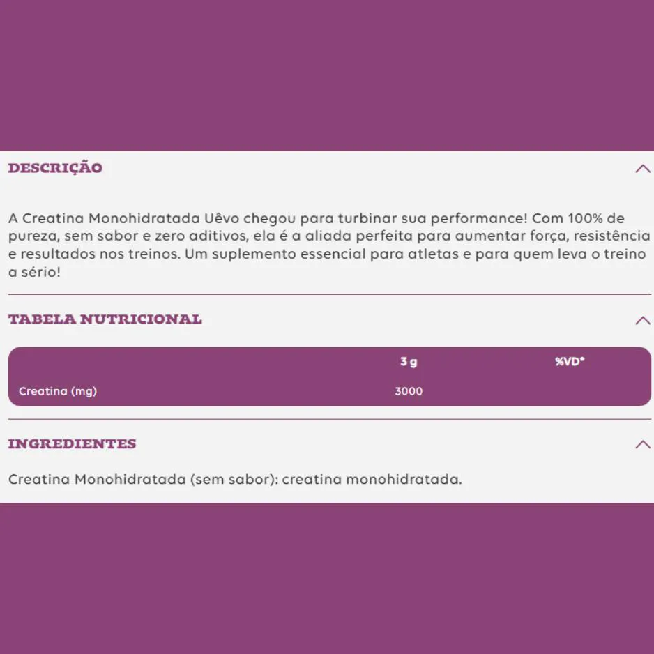 - Suplemento 100% puro, sem sabor e sem aditivos, ideal para atletas e praticantes de atividade física.