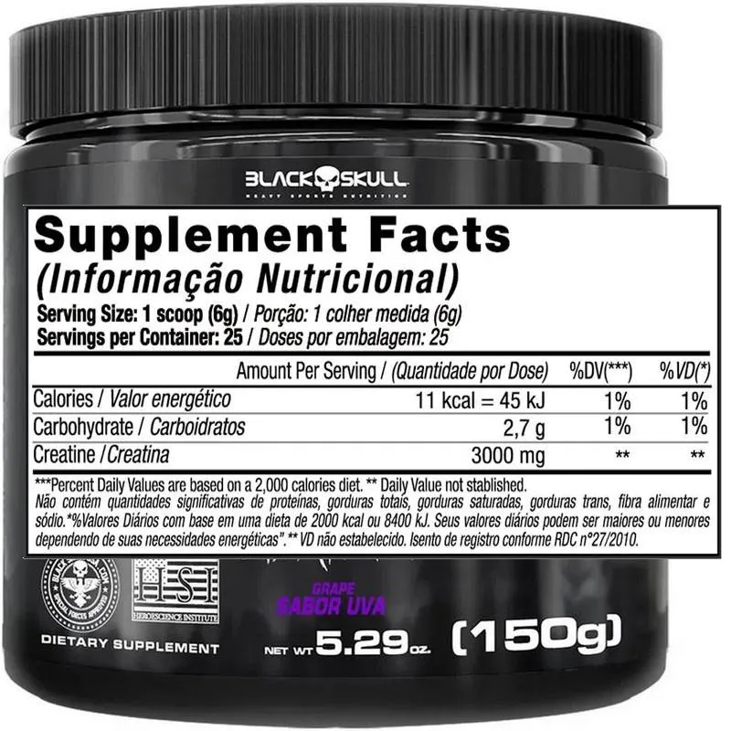 A Creatine Turbo da linha Caveira Preta Series da Black Skull USA é um suplemento a base de Creatina Monohidratada e Maltodextrina. Onde é comprovado que, a utilização de carboidratos em conjunto com a creatina, promove maior eficácia no efeito da creatina, além do carboidrato agir no aumento de energia, visando apoiar seus resultados nas atividades físicas, oferecendo maior energia e consecutivamente, melhor desempenho. Com seus benefícios, apoia também o ganho de massa e a conclusão dos treinos mantendo a qualidade de suas repetições. Sendo recomendado o consumo de 6g (1 ¼ colher de chá) ao dia. INGREDIENTES: Creatina Monohidratada e maltodextrina. NÃO CONTEM GLÚTEN.