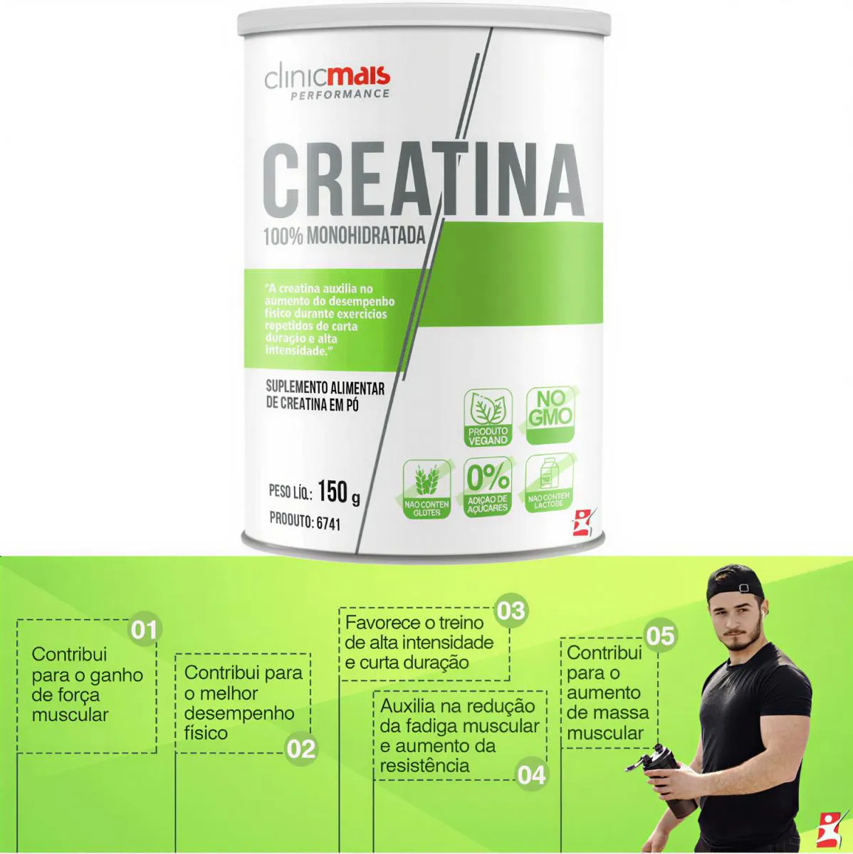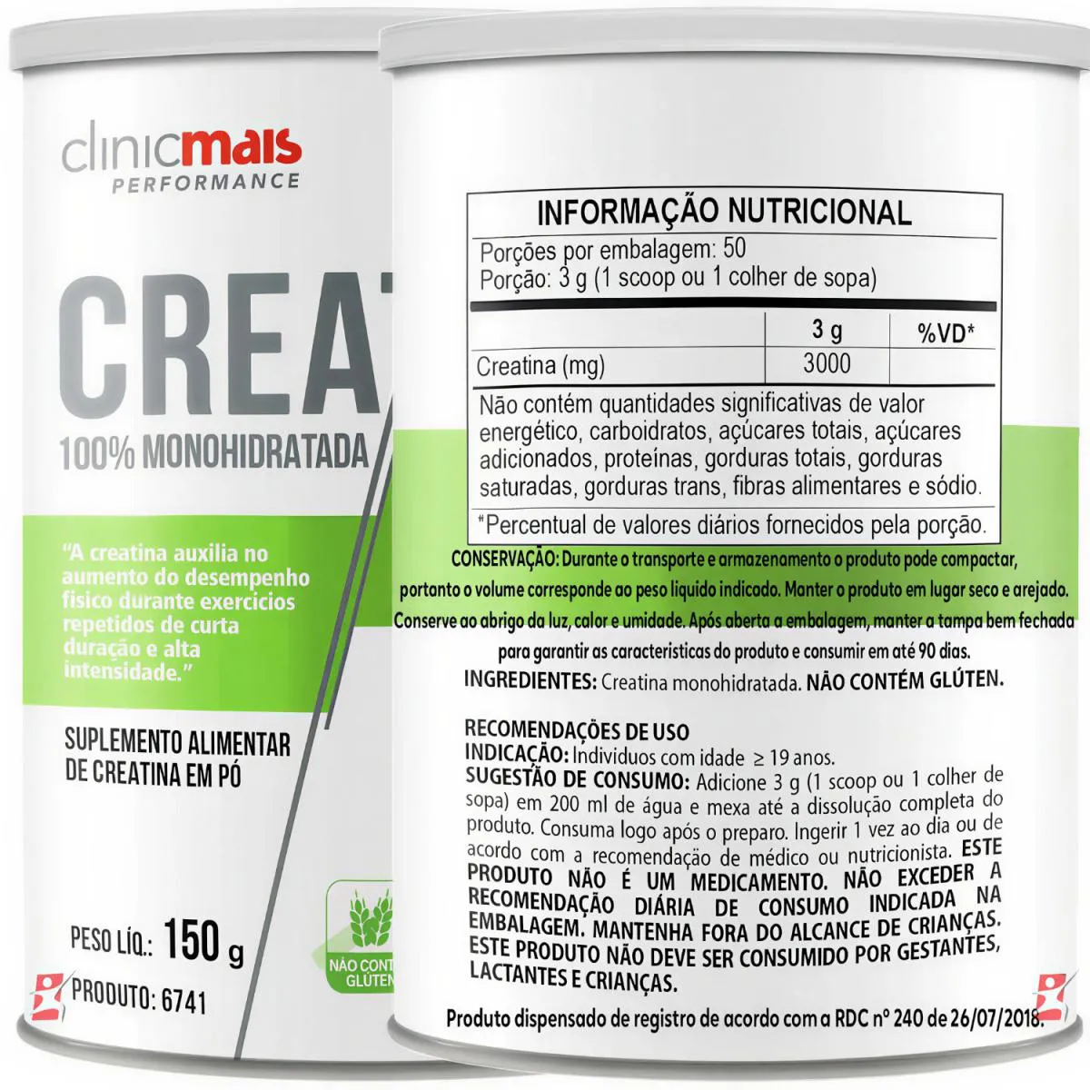 DESCRIÇÃO A creatina Monohidratada é um suplemento em pó amplamente utilizado por atletas e praticantes de atividades físicas que buscam melhorar seu desempenho esportivo. A creatina é um composto natural encontrado nos músculos e desempenha um papel essencial no fornecimento de energia para exercícios de alta intensidade e curta duração. A Creatina Monohidratada da ClinicMais é Micronizada 200 Mesh, o que significa que a creatina foi processada em partículas muito finas, com um tamanho médio de 74 micrômetros (µm). A micronização é um processo que reduz o tamanho das partículas da creatina, tornando-a mais solúvel, e permitindo uma digestão mais fácil e rápida. Quanto maior a classificação “mesh”, menor é o tamanho das partículas — o que melhora consideravelmente a dissolução em água e a biodisponibilidade no organismo. INGREDIENTES DA CREATINA MONOHIDRATADA? Creatina Monohidratada (3g por porção) – Substância naturalmente presente no organismo, armazenada nos músculos na forma de fosfocreatina. Seu consumo auxilia no aumento da disponibilidade de ATP (trifosfato de adenosina), que é a principal fonte de energia para contrações musculares rápidas e explosivas. A creatina é um dos suplementos mais estudados no meio esportivo e é amplamente utilizada por pessoas que buscam aumento de força, potência e resistência muscular. Nos fóruns de saúde e esportes, é comum encontrar relatos de praticantes de musculação, esportes de alta intensidade e resistência que utilizam a creatina para melhorar a recuperação muscular e o desempenho nos treinos. Estudos científicos indicam que a suplementação com creatina pode promover aumento na força muscular, melhora da recuperação pós-exercício e auxílio na resistência durante atividades de alta intensidade. Além disso, pesquisas apontam que a creatina pode ter um papel no suporte cognitivo, ajudando no funcionamento cerebral em condições de alto esforço mental. A CREATINA MONOHIDRATADA POSSUI CONTRAINDICAÇÕES? Este suplemento é indicado para indivíduos com idade igual ou superior a 19 anos. Gestantes, lactantes e crianças não devem consumi-lo. Pessoas com condições médicas preexistentes ou que utilizam medicamentos devem consultar um profissional de saúde antes do consumo. A CREATINA MONOHIDRATADA É VEGANA? Sim. A creatina monohidratada é um composto sintético e não contém ingredientes de origem animal, sendo adequada para veganos. QUAL A FORMA CORRETA DE USO DA CREATINA MONOHIDRATADA? Sugestão de consumo: Quantidade diária: Adicione 3g (1 scoop ou 1 colher de sopa) em 200ml de água, mexendo até completa dissolução. Horário ideal: Pode ser consumida a qualquer momento do dia, sendo mais comum pré ou pós-treino para otimizar a recuperação muscular e o desempenho esportivo. Modo de uso: O consumo deve ser feito logo após o preparo para garantir a eficácia da suplementação. CONSCIENTIZAÇÃO SOBRE O USO DO SUPLEMENTO: Para obter os melhores resultados, a suplementação com creatina deve ser contínua, pois sua ação ocorre de forma cumulativa no organismo. Assim como a alimentação equilibrada, o uso regular da creatina contribui para o desempenho físico e melhora da composição muscular ao longo do tempo. DICAS PARA POTENCIALIZAR OS RESULTADOS: Combine com exercícios de alta intensidade, como musculação, sprint e esportes de potência, para maximizar os efeitos da creatina. Mantenha uma boa ingestão de água, pois a creatina pode aumentar a retenção de líquidos musculares, exigindo uma hidratação adequada. Associe o consumo a carboidratos ou proteínas, pois estudos indicam que a absorção da creatina pode ser otimizada quando ingerida junto a fontes de glicose ou aminoácidos. A Creatina Monohidratada é regulamentada pela ANVISA? Sim. Este produto é isento de registro conforme a Resolução RDC nº 240/2018 da ANVISA. "ESTE PRODUTO NÃO É UM MEDICAMENTO. NÃO EXCEDER A RECOMENDAÇÃO DIÁRIA DE CONSUMO INDICADA NA EMBALAGEM. MANTENHA FORA DO ALCANCE DE CRIANÇAS. ESTE PRODUTO NÃO DEVE SER CONSUMIDO POR GESTANTES, LACTANTES E CRIANÇAS."