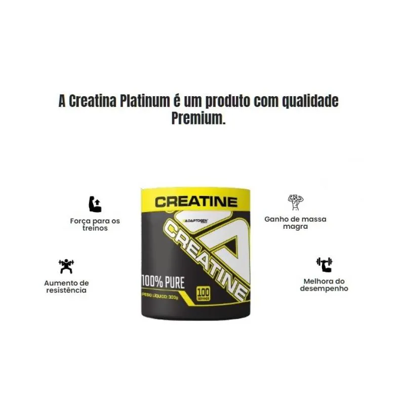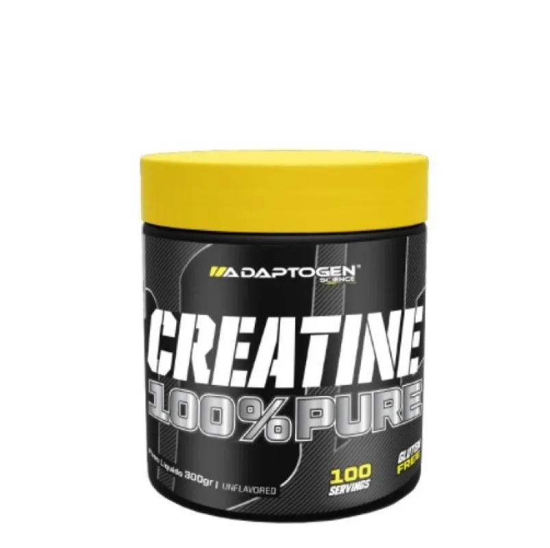 Creatine 100% Pure (300g) - Adaptogen A creatina é um dos suplementos alimentares com mais estudos comprovando sua eficácia. Ela é um aminoácido de origem animal, mas que também é produzida pelo nosso próprio corpo. Além de auxiliar no aumento de força, aumentar a resistência anaeróbia, ela reduz o dano muscular e a dor causada por exercícios. Ela é essencial para os praticantes de atividades físicas que buscam o ganho de massa muscular. A Creatine 100% Pure é um produto com qualidade premium, aprovado pela ANVISA e entrega 100% do que está no rótulo. Todos os produtos da Adaptogen Science passam por rigorosos testes antes de serem distribuídos, prática que faz com que os consumidores confiem e atestem a qualidade dos suplementos que estão consumindo.Benefícios:* Auxilia no ganho de força;* Mais explosão e resistência ao esforço físico;* Reposição dos níveis de ATP;* Melhora de performance;* Auxilia no ganho de massa muscular;* Hipertrofia muscular.