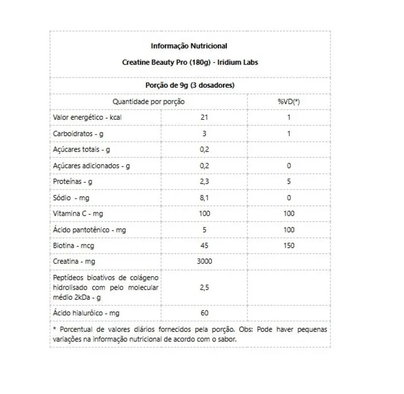 creatina Beauty Pro – Performance e beleza em Um Só Suplemento A Creatina Beauty Pro é ideal para mulheres que desejam melhorar sua performance física sem abrir mão dos cuidados com a beleza. Sua fórmula inovadora combina 3g de creatina monohidratada, que aumenta força e resistência muscular, com ingredientes como colágeno Verisol®, Ácido Hialurônico Haplex™ Plus, Biotina e vitamina c, que promovem a saúde da pele, cabelos e unhas. Com ingredientes patenteados e eficácia comprovada, a Creatina Beauty Pro proporciona resultados tanto na academia quanto na sua rotina de autocuidado. Benefícios: - 3g de Creatina Monohidratada – aumenta a força e a resistência muscular;- 2,5 g de Colágeno Verisol - melhora a saúde de da pele, unhas e cabelos;- 60mg de Ácido hialurônico – responsável pela hidratação da pele;- 45mcg de Biotina – Ajuda a fortalecer cabelos e unhas, promovendo o crescimento saudável dos cabelos;- 100mg de vitamina C – Antioxidante que protege a pela e estimula a produção de colágeno.