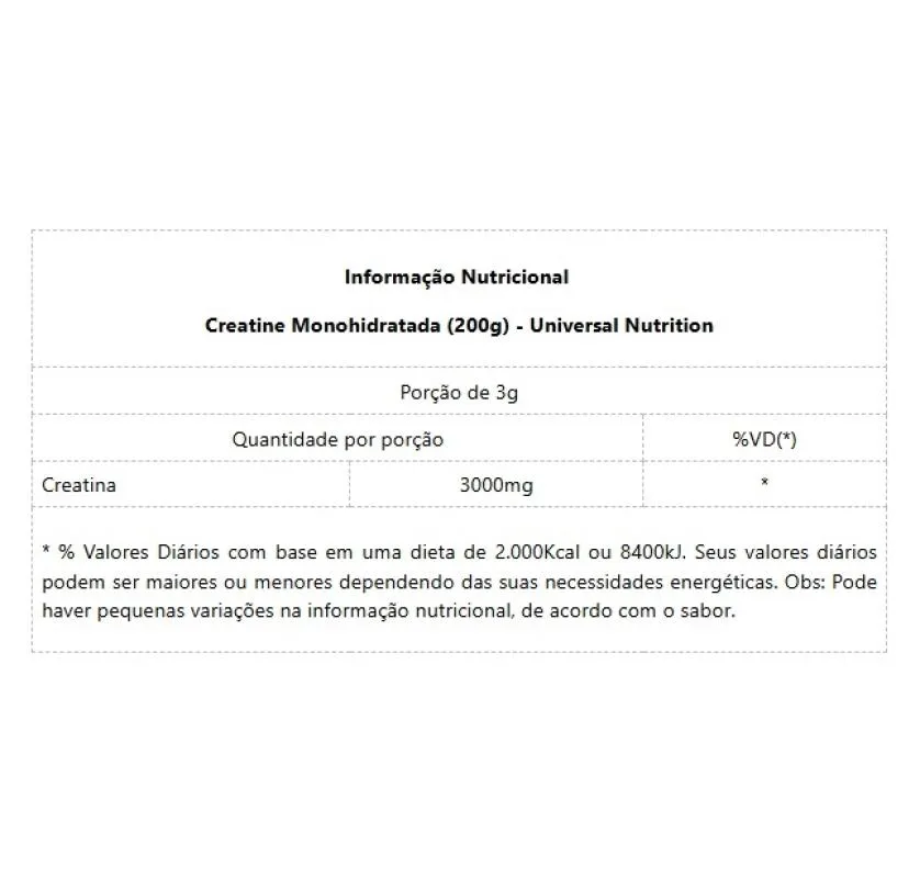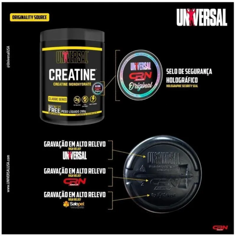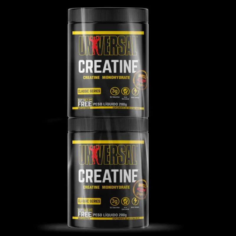 Creatine Monohydrate Combo (200g+200g) A creatina Universal Nutrition é um suplemento de creatina monoidratada indicada para quem busca o aumento da massa muscular e melhor rendimento e força em treinamentos de alta intensidade. A creatina figura entre os principais aminoácidos consumidos por atletas que desejam ganhar músculos e melhorar o desempenho nos treinos, atuando na reposição dos estoques de ATP e, consequentemente, aumentando os níveis de energia muscular. E a Creatina Universal é a melhor e mais pura creatina disponível no mercado, materia prima importada que garante qualidade e a pureza de sua matéria prima. BENEFÍCIOS: - Aumento de Força Muscular; - Ganho de Massa Muscular; - Recuperação Muscular; - Ação rápida no pós-treino.
