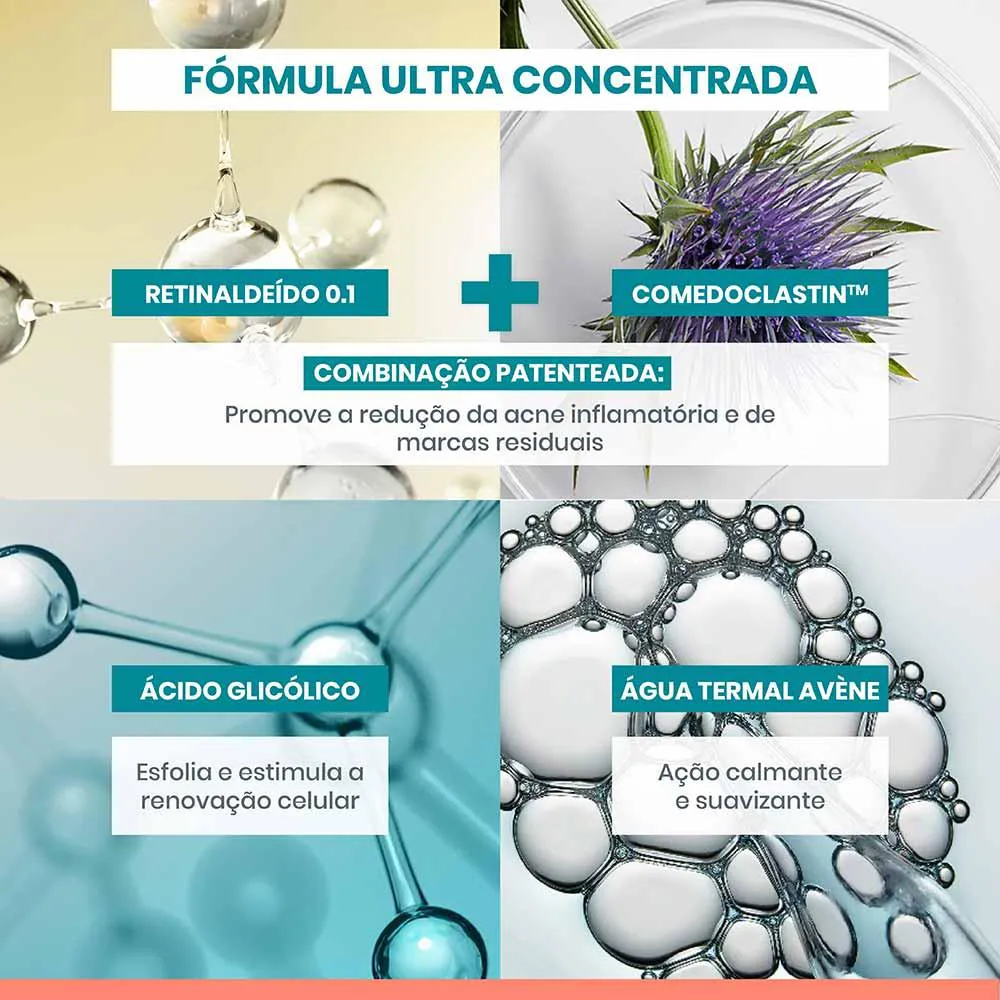 - Comedoclastin: Ativo patenteado com mais de 25 anos de pesquisa que interrompe o ciclo da acne.