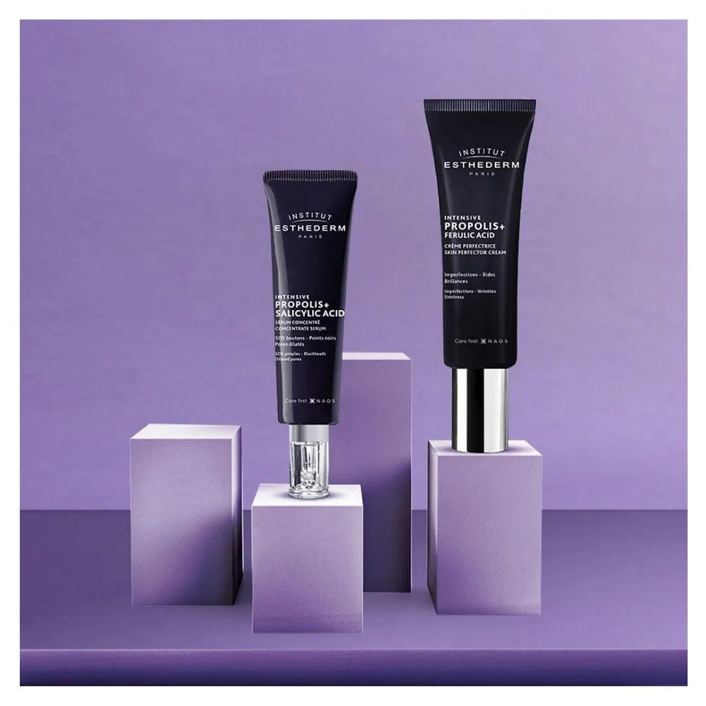 Intensive Propolis+ Ferulic Acid Creme Skin Perfector é um creme fluido com efeito blur imediato, que suaviza rugas e poros aparentes, ao mesmo tempo que reduz imperfeições da pele oleosa. Sua fórmula contém uma associação exclusiva de ativos: Propolis + Acido ferulico + Hexapeptideo + pós matificantes, que promovem eficácia nas imperfeições da pele oleosa e na redução dos sinais da idade. Textura fluida, leve, de absorção imediata, ideal para peles oleosas com rugas e linhas finas.