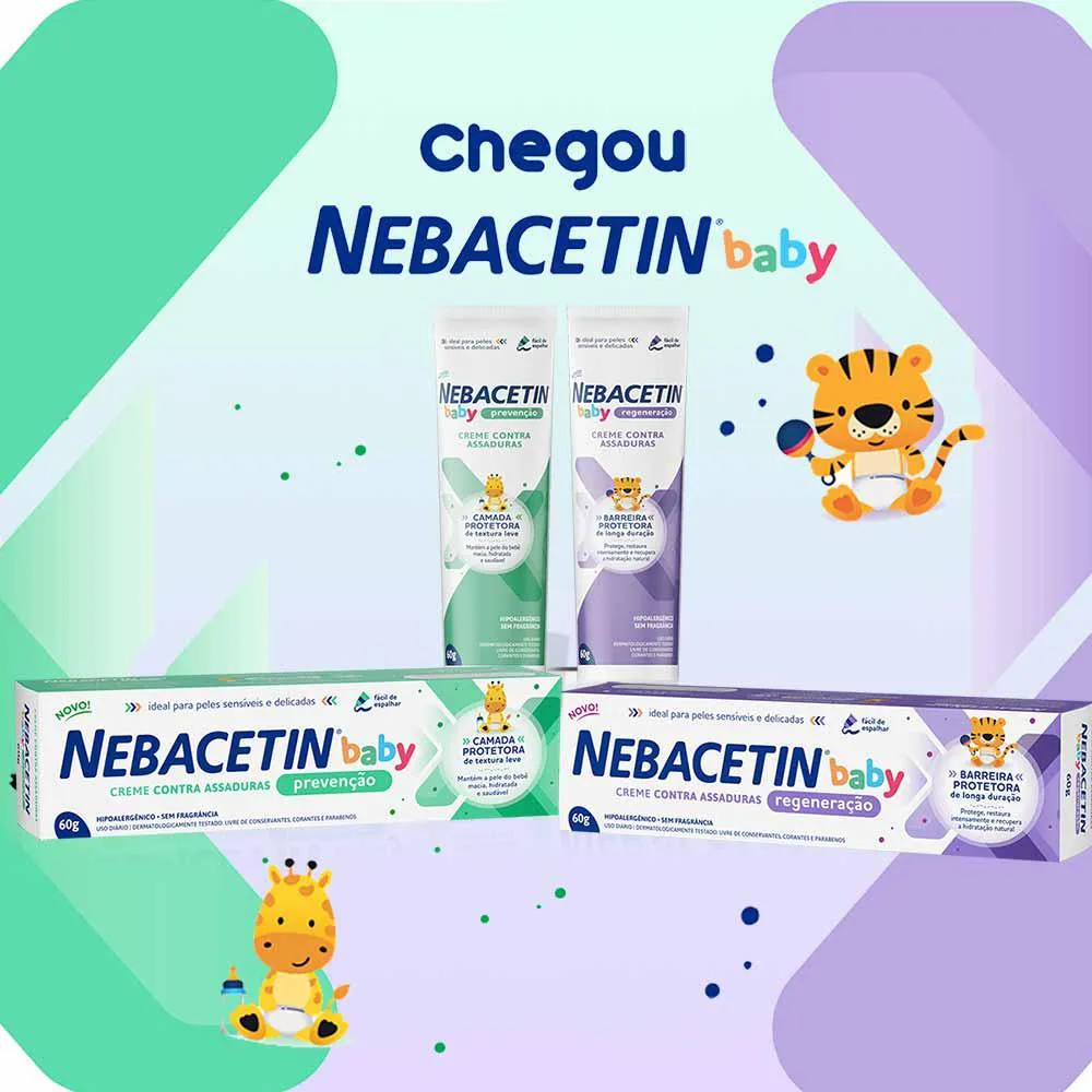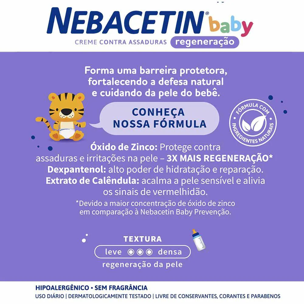 Nebacetin Baby Regeneração é um creme preventivo de assaduras de uso diário que forma uma camada protetora de textura leve, mantendo a pele do bebê macia hidratada e saudável. Já Nebacetin Baby Regeneração é um creme para o cuidado da pele já sensibilizada, com 3X mais poder de regeneração*, que forma uma barreira protetora de longa duração.