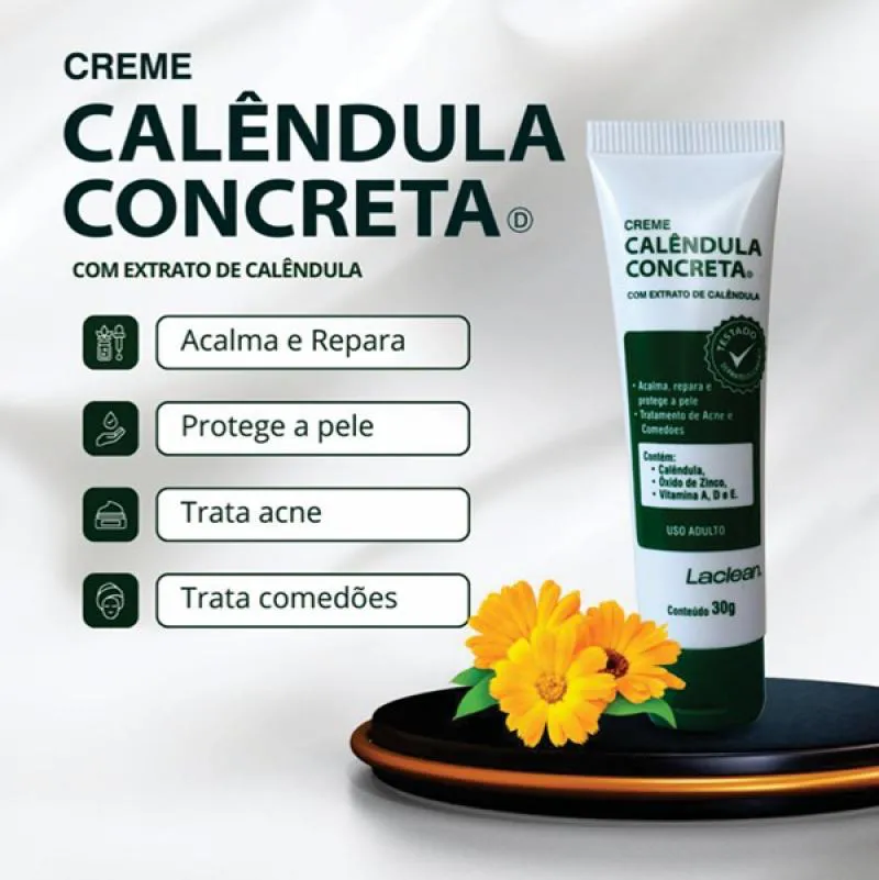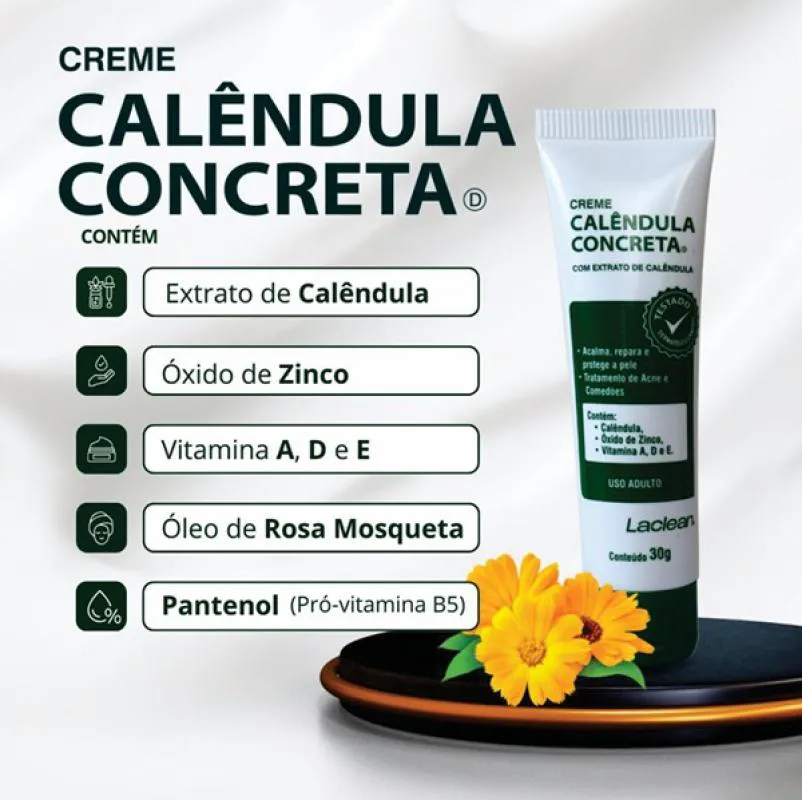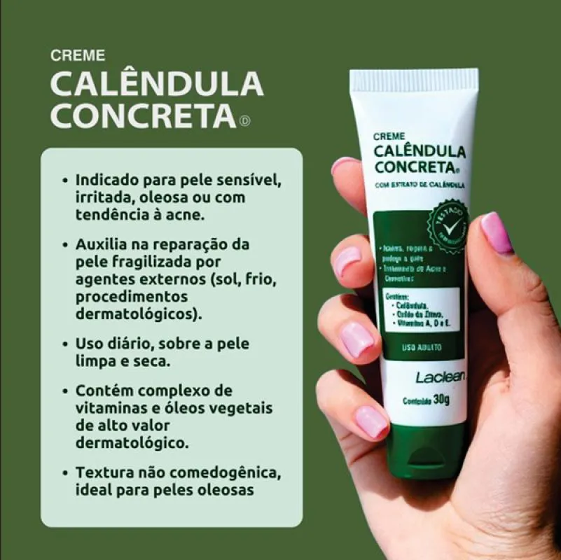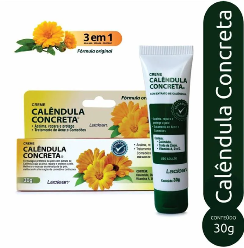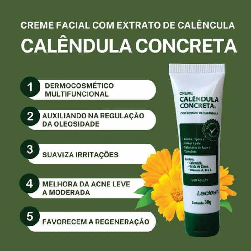O Creme Calêndula Concreta 30g LACLEAN é um produto delicado e eficaz para o cuidado da pele. Formulado com extrato de calêndula, esse creme oferece propriedades suavizantes, calmantes e regeneradoras, sendo ideal para peles sensíveis e irritadas. A calêndula é conhecida por suas propriedades anti-inflamatórias e cicatrizantes, o que torna este creme uma excelente opção para aliviar pequenos machucados, queimaduras superficiais, assaduras e outras irritações da pele.