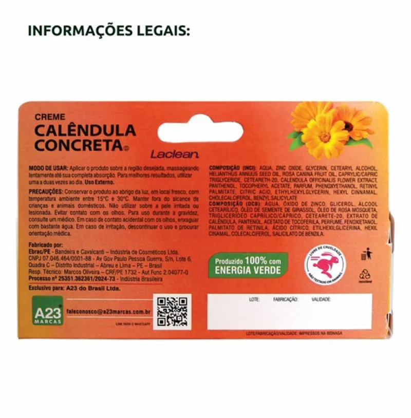 Com uma textura cremosa e de fácil absorção, o Creme Calêndula Concreta LACLEAN ajuda a manter a pele hidratada, protegida e com uma sensação de conforto imediato. Seu uso regular promove a regeneração celular e a restauração da integridade da pele, deixando-a mais saudável e suavizada.