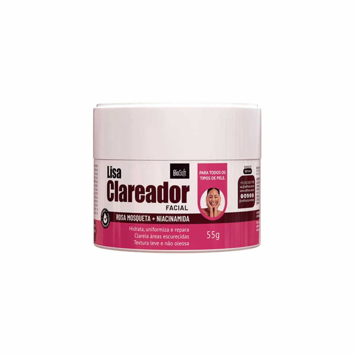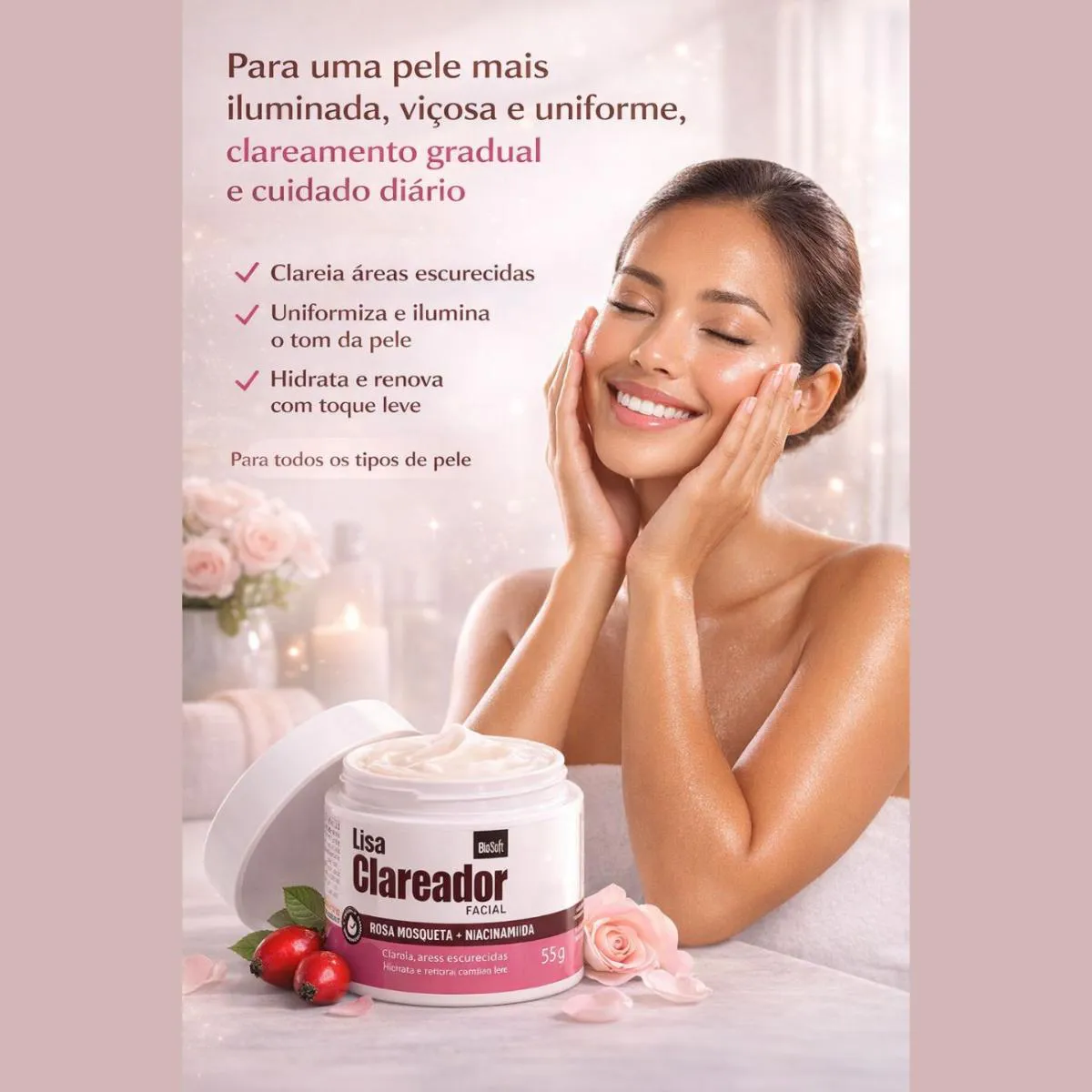 Clareador de manchas, creme rosa mosqueta, niacinamida pura, tirar manchas do rosto, clareador facial bio soft, uniforme skin, Revitalização facial, melasma, clareador noturno, hidratante clareador.