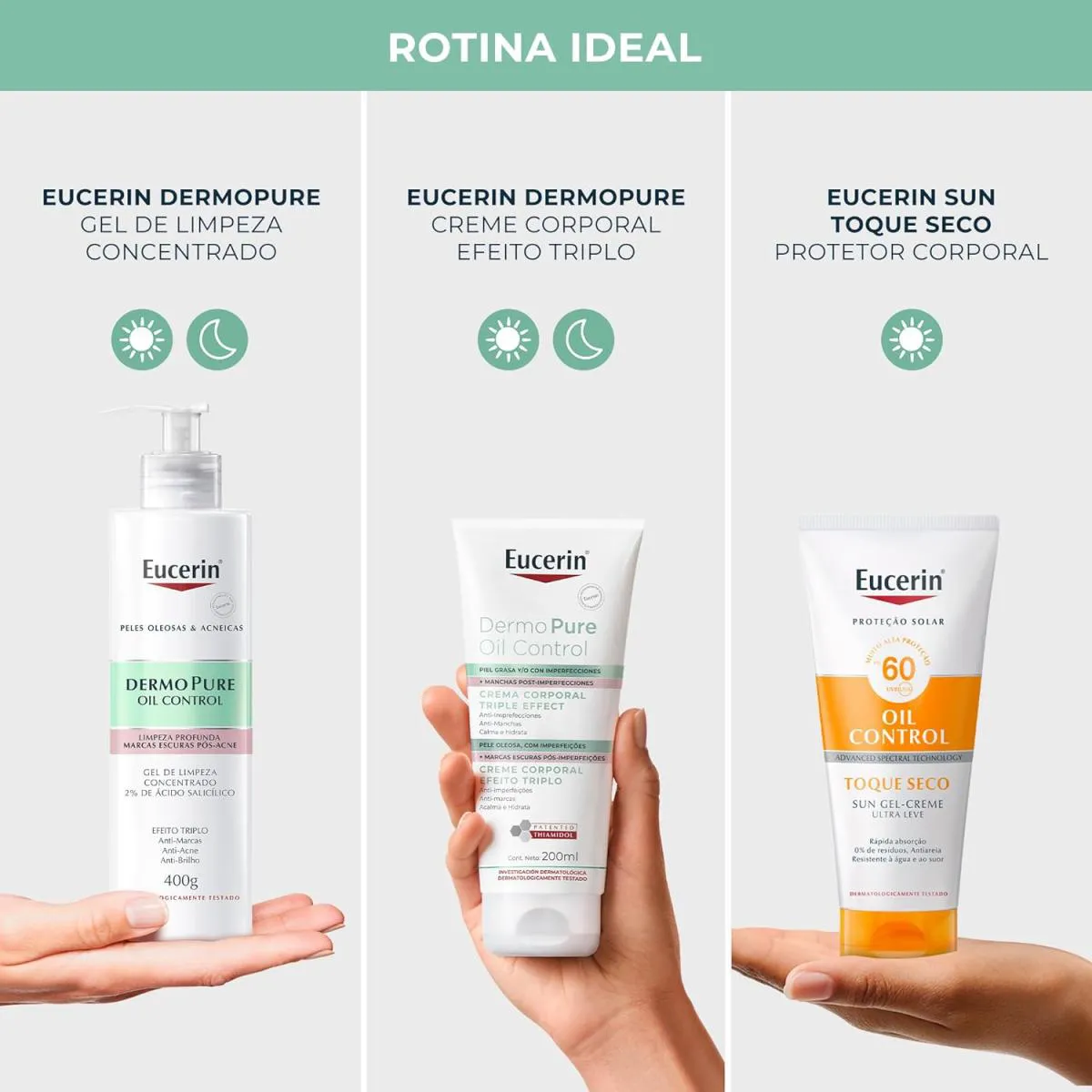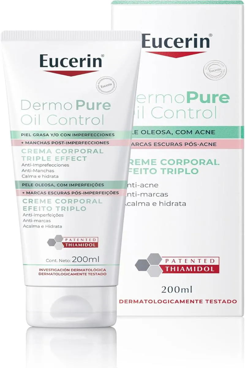 - O Eucerin DermoPure Oil Control Creme Corporal Efeito Triplo para áreas específicas do corpo é um tratamento dermatológico avançado para pele oleosa e com imperfeições. - Com três benefícios em uma única fórmula, ele oferece ação anti-imperfeições, anti-marcas, acalma e hidrata a pele. - Este creme é indicado para reduzir imperfeições persistentes e marcas escuras pós-imperfeições, com a ajuda do Ácido Salicílico e do Thiamidol. - Além disso, a Licochalcona A acalma a pele, enquanto a Glicerina proporciona hidratação profunda, deixando a pele mais equilibrada e saudável. - Quais os benefícios do Creme Corporal Eucerin DermoPure Oil Control Efeito Triplo? - Anti-imperfeições; - Antimarcas; - Acalma e hidrata; - Para pele oleosa; - Ácido Salicílico e Thiamidol; - Textura leve e rápida absorção. - Modo de uso: - Aplique o Creme Corporal Eucerin DermoPure Oil Control Efeito Triplo diariamente sobre as áreas específicas previamente limpas e secas. - Espalhe até sua completa absorção pelo tecido epidérmico - idealmente após o banho quando os poros estão mais receptivos aos tratamentos.
