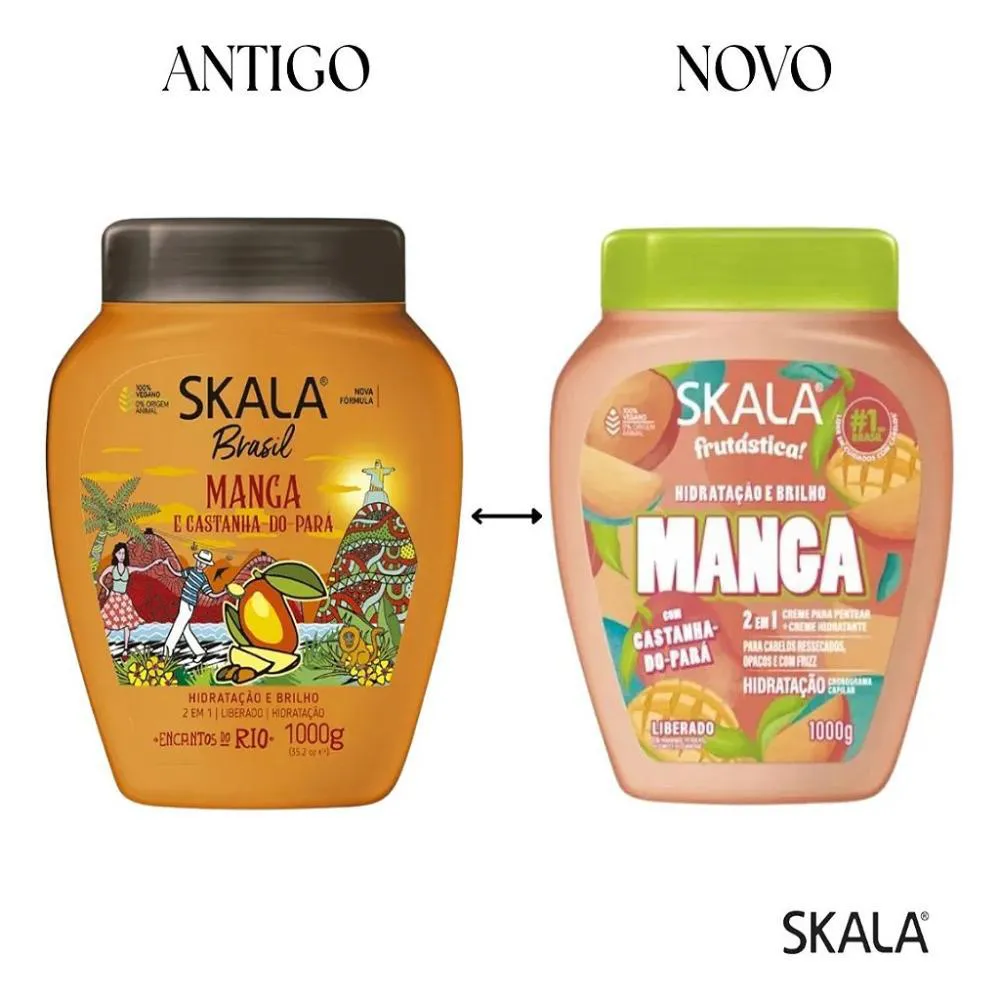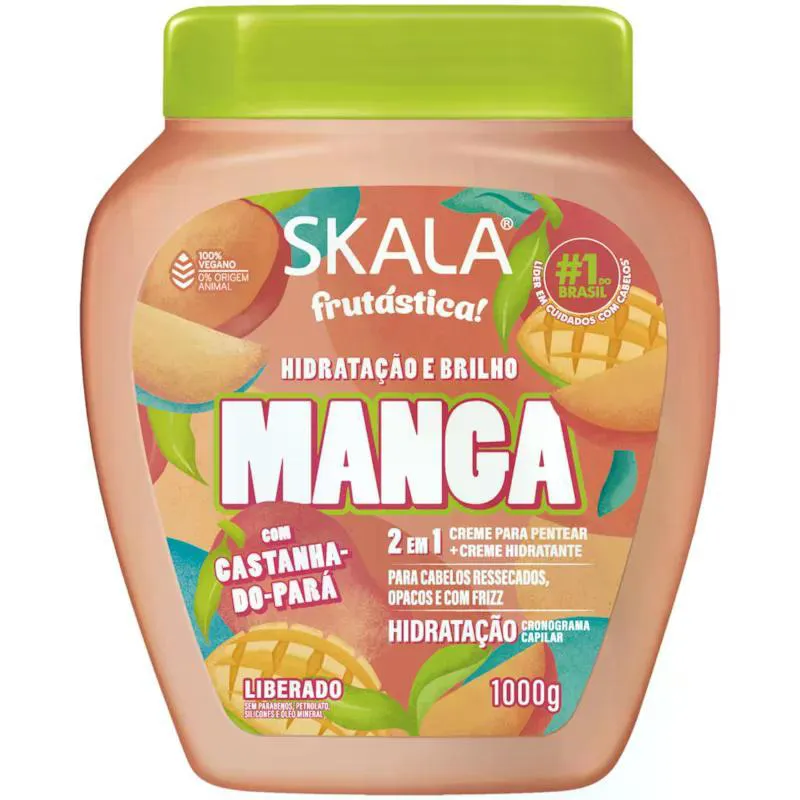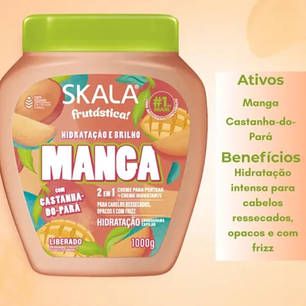 O Creme de Tratamento Skala Manga 2 Em 1 é um produto capilar desenvolvido para hidratação e cuidado dos cabelos, formulado com ingredientes naturais como Castanha-do-Pará. Sua composição é livre de parabenos, petrolato, silicones e óleo mineral, fazendo parte da linha Frutástica da marca Skala. Possui uma fórmula que combina vitaminas e nutrientes de frutas, com foco especial na manga. Serve para hidratar, devolver umidade, diminuir o frizz e proporcionar brilho aos cabelos ressecados, opacos e com frizz, oferecendo uma experiência sensorial de cuidado capilar.
