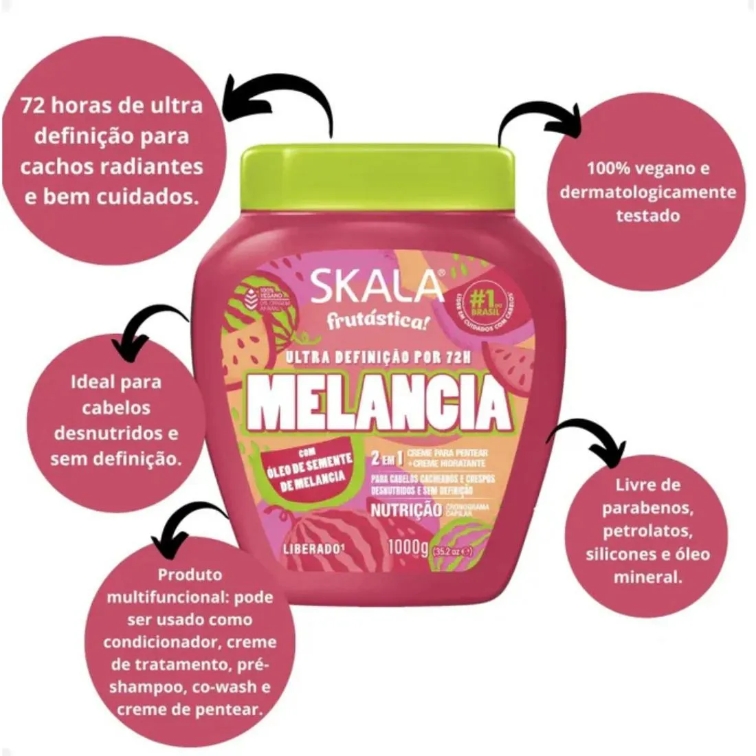 O Creme de Tratamento Skala Melancia 1kg é uma máscara capilar multifuncional desenvolvida especialmente para cabelos cacheados e crespos. Sua fórmula combina ingredientes como óleo de semente de melancia, óleo de argan e vitaminas A e C, proporcionando hidratação intensa, nutrição e definição prolongada dos cachos por até 72 horas.