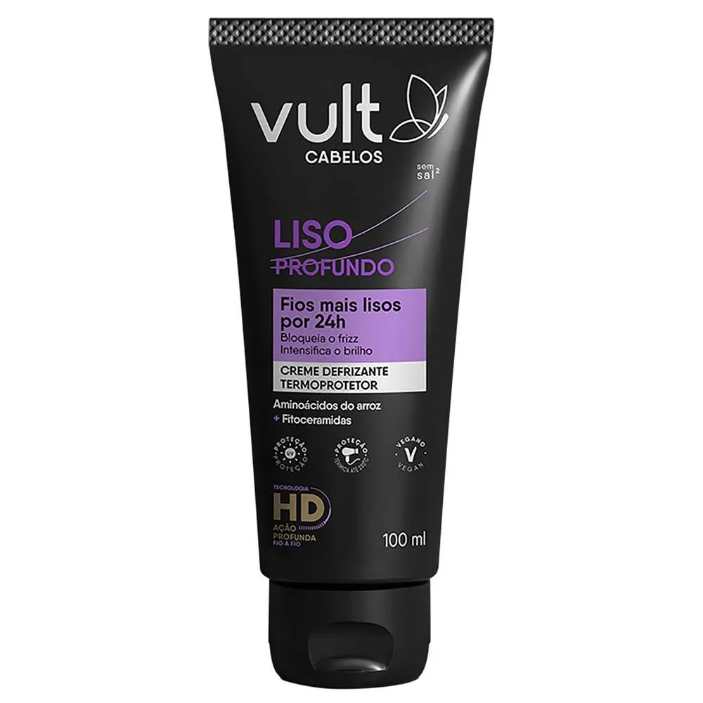 VULT CREME DEFRIZANTE LISO Fios mais lisos por 24h bloqueia o frizz intensifica o brilho Vult Liso Profundo, com aminoácidos do arroz e fitoceramidas, confere cabelos 2x mais lisos e mantém os fios alinhados por mais tempo, proporcionando cabelos sem frizz e com movimento.