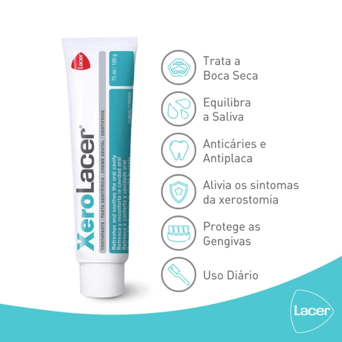 - Xerolacer é uma linha de produtos indicados como auxiliar diário para higiene oral de pacientes que apresentam desconforto e ressecamento na cavidade oral. - Oferece proteção dos dentes e gengivas, acalma a sensação de secura oral, refresca a boca, remineralize esmalte dos dentes e fortalece as gengivas. - Além disso, auxilia na prevenção do aparecimento das disfunções orais causadas pela saliva reduzida. - Utilizar após cada refeição. Aplique uma pequena quantidade de Xerolacer em uma escova de cerdas macias. - Composições que auxiliam com sua ação antisséptica, substitutos salivares. - Estimulantes salivares regeneradores, anti-inflamatórios e agentes anticarigênicos.