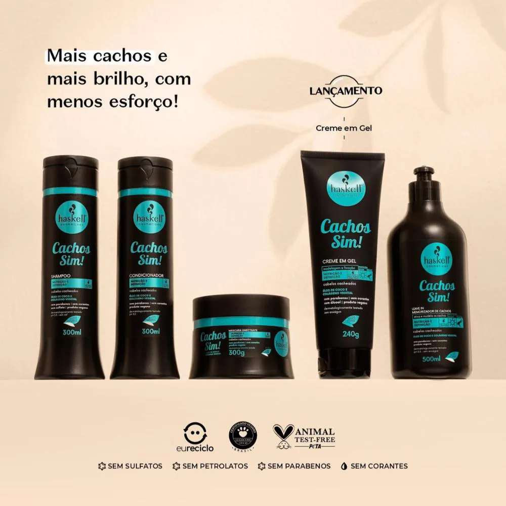 Creme em Gel Cachos Sim! Promove definição e fixação para cabelos cacheados. Ideal para fixar penteados e remodelar no day after.