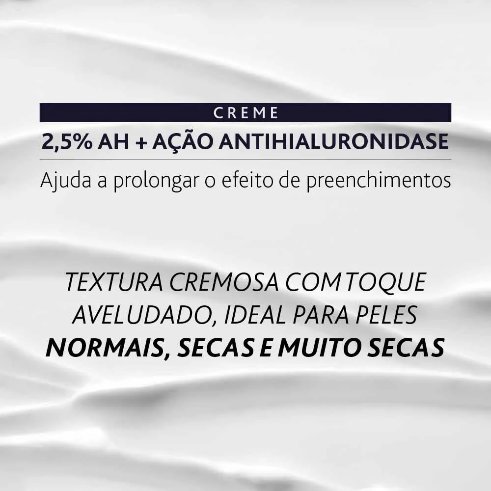Composto por três formas distintas de Ácido Hialurônico, este creme combina moléculas de alto peso molecular, encapsuladas e médio peso molecular. Essa associação garante não apenas uma hidratação profunda, mas também estimula a síntese natural do ácido na epiderme.