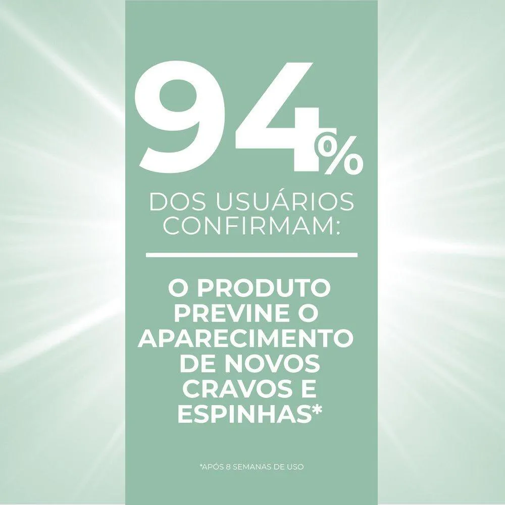 - Previne o reaparecimento de novos cravos e espinhas, com 94% de aprovação.
