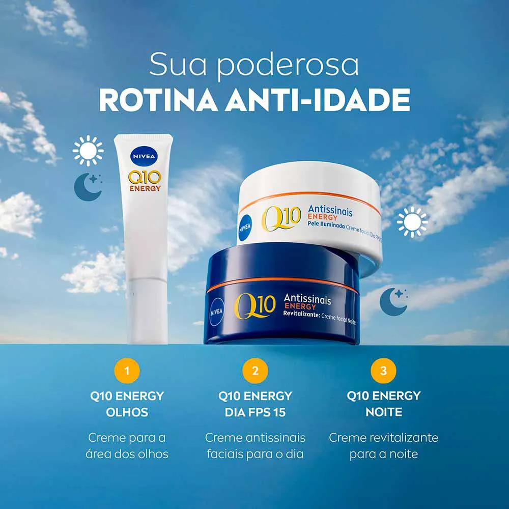 O que é? NIVEA Creme Facial Antissinais Q10 Energy Olhos é um creme que reduz a profundidade das rugas ao redor dos olhos em 4 semanas de uso contínuo.
