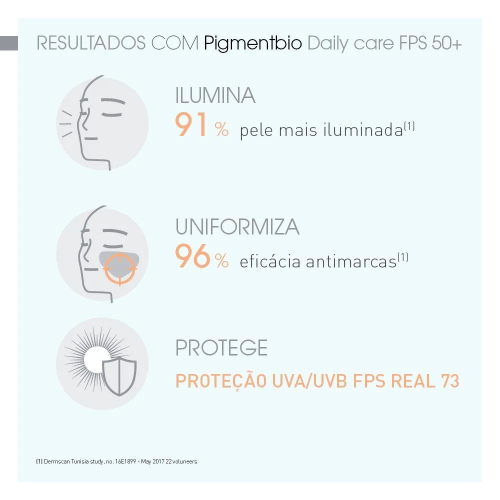 A fórmula inédita de Pigmentbio Daily Care FPS 50+ traz a patente Lumireveal TechnologyTM, que age em todo o processo biológico da hiperpigmentação para inibi-la desde sua formação, regulando a produção de melanina, até a eliminação das marcas já existentes através de uma intensa renovação celular.
