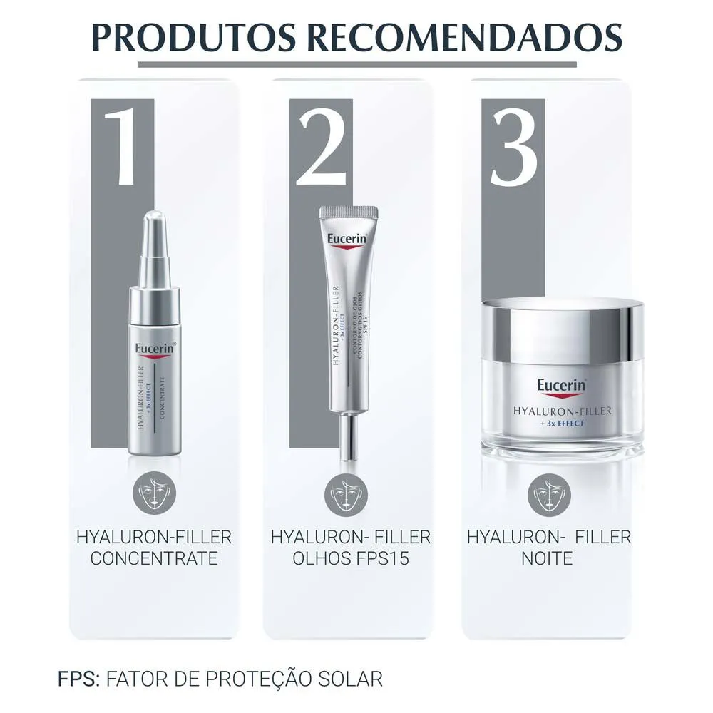 4. Para melhores resultados, use em combinação com o Eucerin Hyaluron-Filler Olhos FPS15, Eucerin Hyaluron-Filler Concentratee Eucerin Hyaluron-Filler Noite.