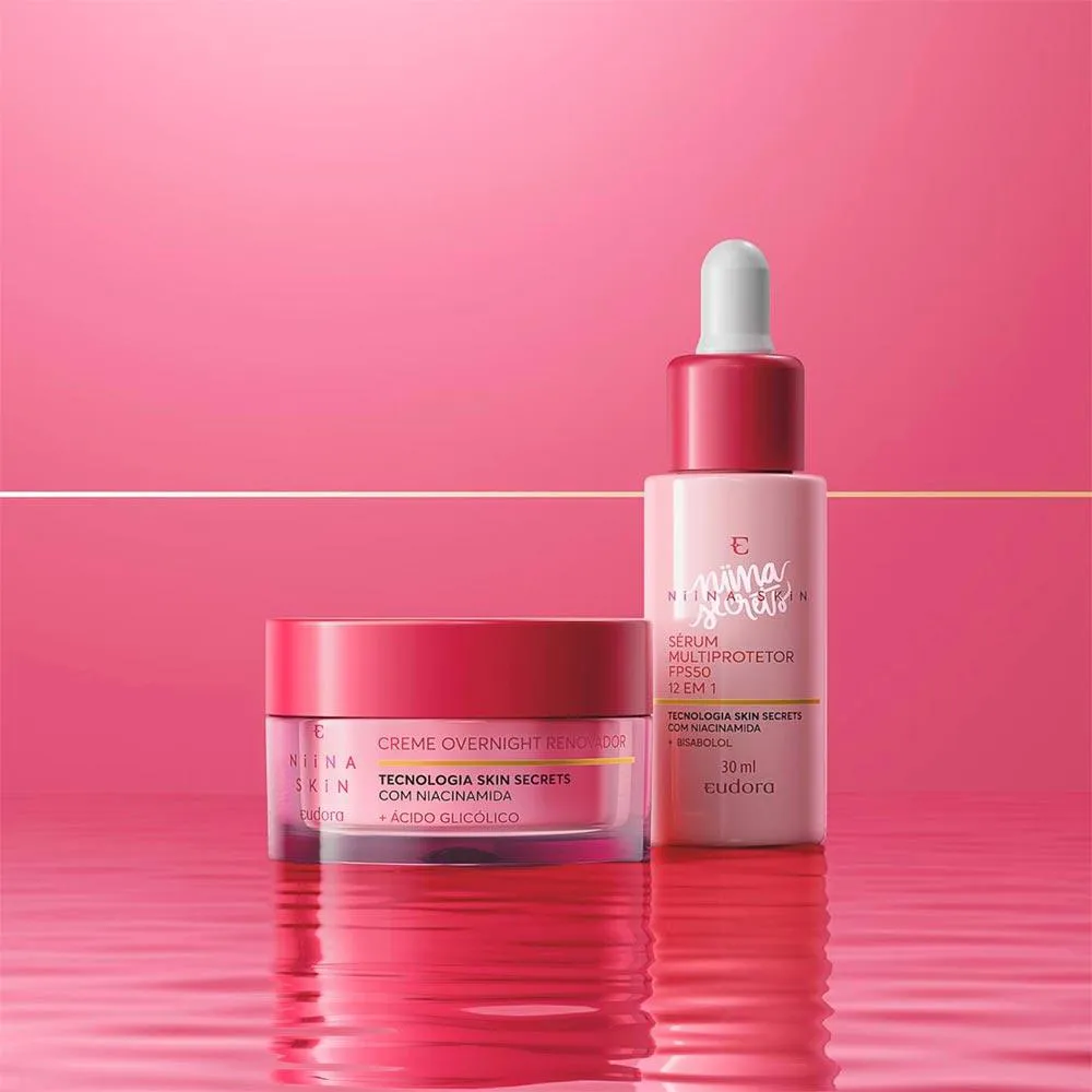 O Creme Overnight Renovador de Niina Skin combina a tecnologia Skin Secrets com Ácido Glicólico, um poderoso AHA que promove um efeito peeling suave enquanto você dorme: acelera a renovação celular da pele, promovendo uma leve esfoliação química que uniformiza o tom da pele, reduzindo as diferenças de tonalidade enquanto melhora a textura: linhas, imperfeições e poros. Além disso, sua textura gel-creme oil-free e de rápida absorção deixa um acabamento aveludado que hidrata profundamente, sendo adequado para todos os tipos de pele, inclusive as oleosas.