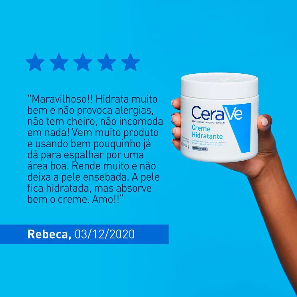 Desenvolvido com dermatologistas, CeraVe Creme Hidratante hidrata e ajuda a restaurar a barreira protetora da pele. Esta fórmula rica e não oleosa contém as 3 ceramidas essenciais para a pele e ácido hialurônico, promovendo hidratação o dia todo através de sua exclusiva tecnologia MVE, de liberação prolongada de ativos hidratantes.