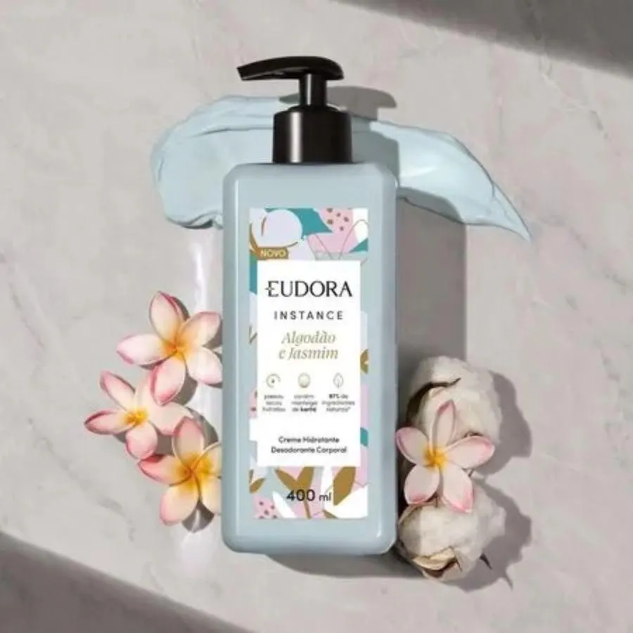 Eudora Instance algodão e Jasmim Creme hidratante desodorante corporal. Eudora Instance Algodão e Jasmim deixa a pele mais macia, hidratada e perfumada com fragrância suave. O Creme Hidratante Eudora Instance Algodão e Jasmim traz a combinação do conforto do Algodão com a sofisticação do Jasmim, com uma fragrância floral delicada e elegante para uma pele perfumada e desodorizada, além de oferecer secagem rápida que não pesa na pele e nem gruda. Este produto é vegano e combina Manteiga de Karité, 97% de ingredientes naturais e glicerina vegetal, para proporcionar hidratação profunda com pele macia e desodorizada. Nenhum produto Eudora é testado em animais, ou seja, este item possui selo Cruelty Free.