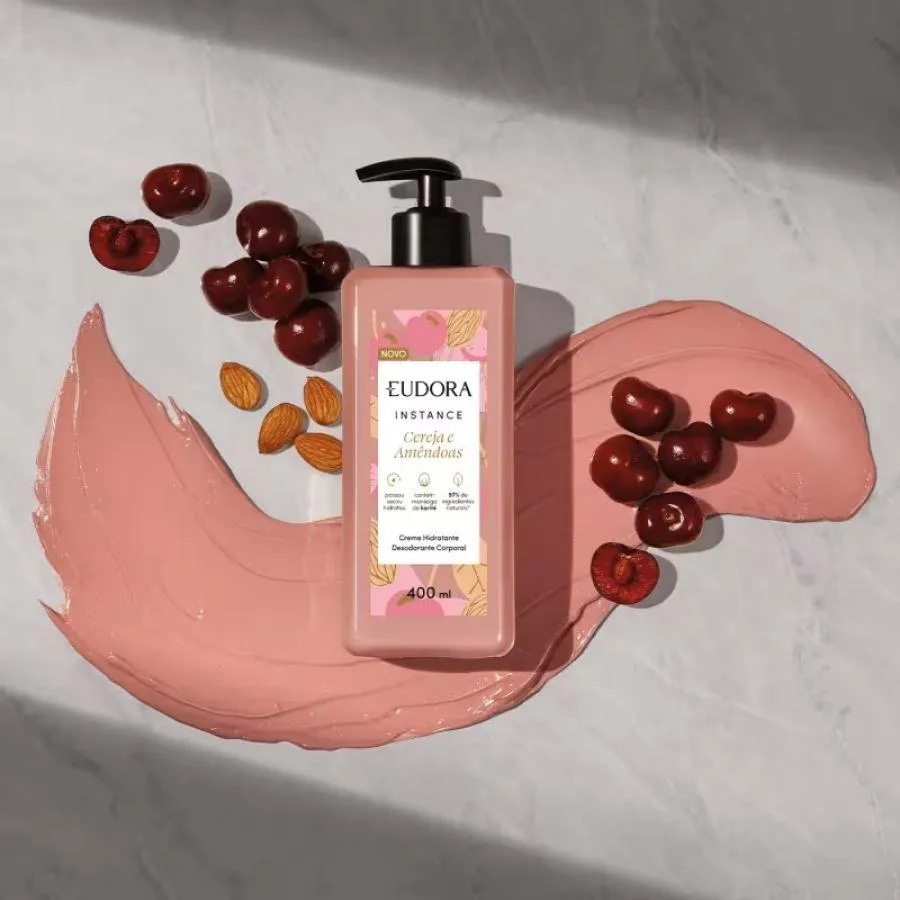 Eudora Instance Cereja e Amêndoas Creme hidratante desodorante corporal. Eudora Instance Cereja e Amêndoas hidrata e perfuma a pele com fragrância floriental adocicada. O Creme Hidratante Desodorante Corporal Eudora Instance Cereja e Amêndoas traz uma fragrância suave e deliciosa. A combinação da suculência da cereja com a cremosidade das amêndoas traz uma fragrância floriental adocicada e envolvente para uma pele perfumada e desodorizada, além de oferecer secagem rápida que não pesa na pele e nem gruda. Este produto é vegano e combina Manteiga de Karité, 97% de ingredientes naturais e glicerina vegetal, junção pensada para proporcionar hidratação profunda com pele macia e desodorizada.