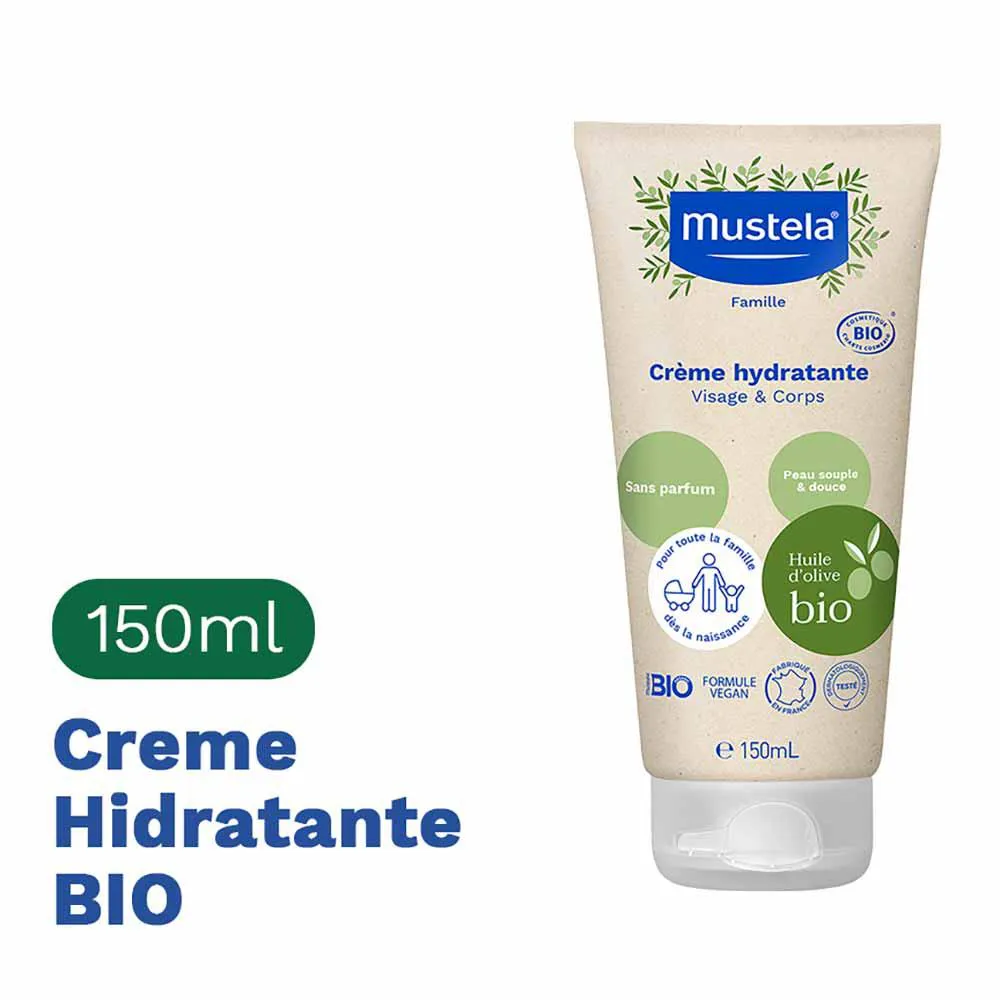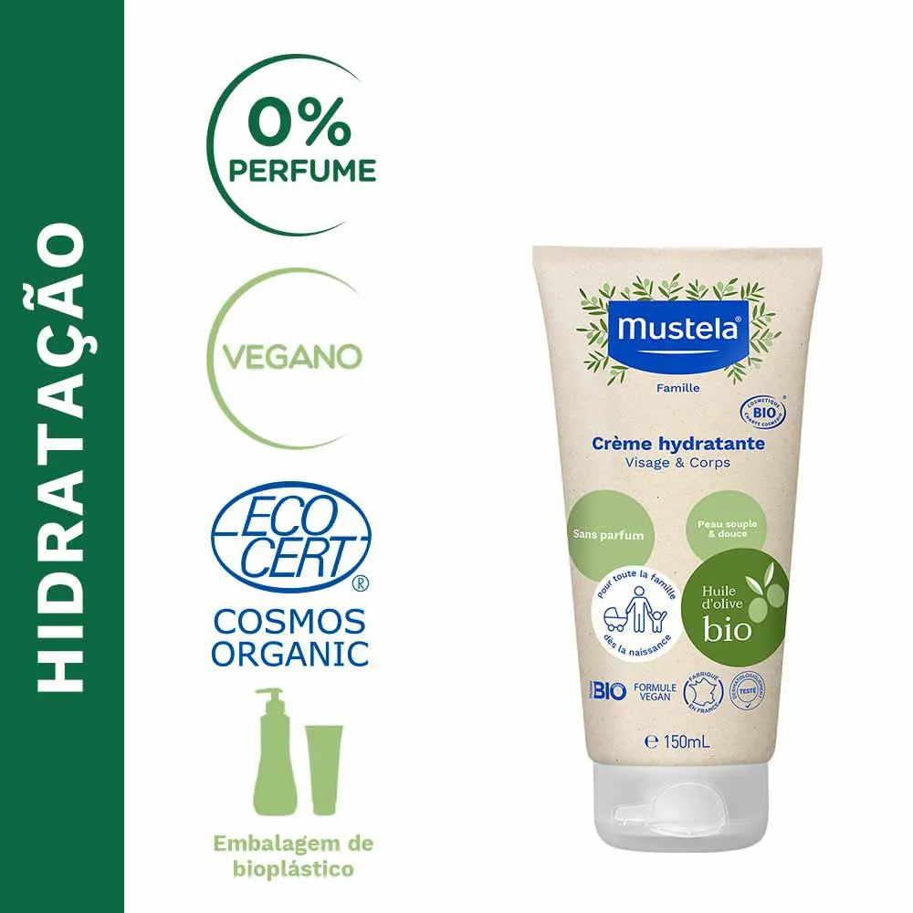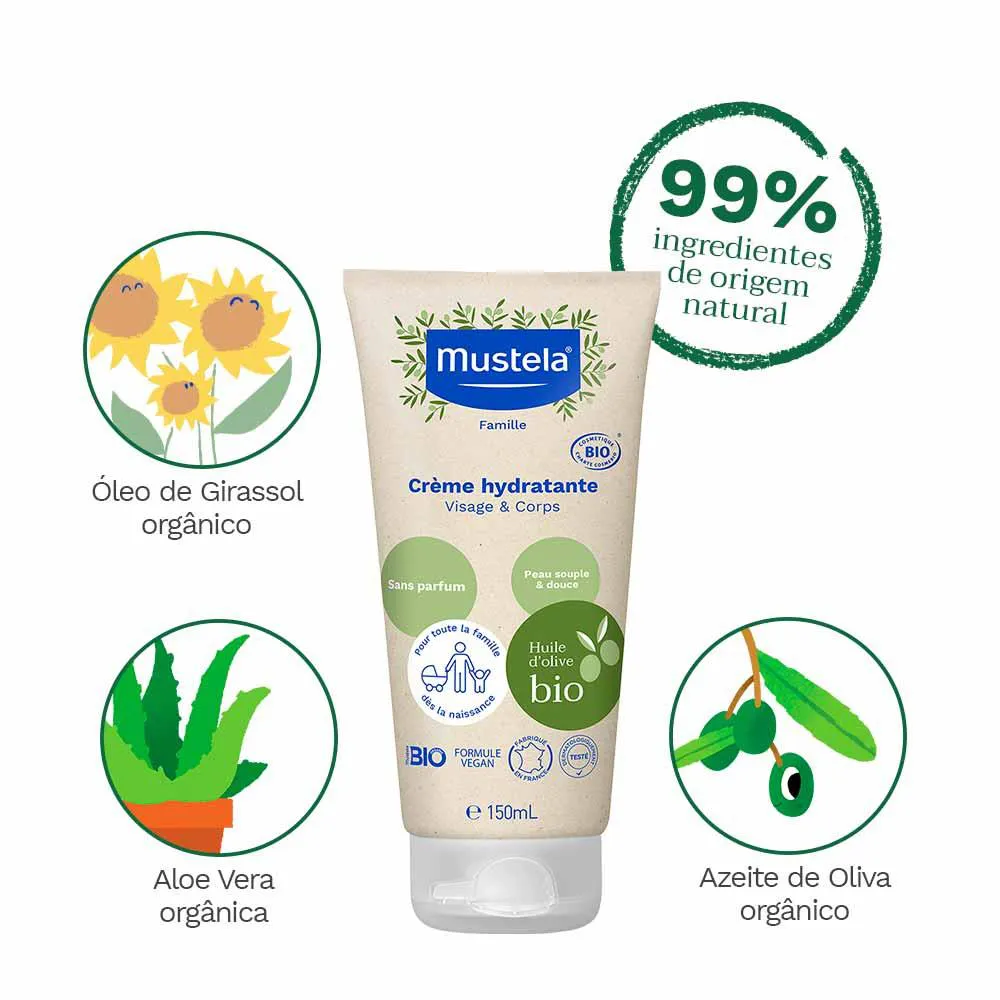 O Creme Hidratante BIO com Aloe Vera, Azeite de Oliva e Óleo de Girassol Orgânicos 150 ml, foi formulado para hidratar as peles mais frágeis e delicadas do rosto e corpo, desde o nascimento. Pode ser usado por toda a família. Sem perfume. Sua formulação com 50% do total de ingredientes provenientes da agricultura orgânica e 99% de ingredientes de origem natural, deixa a pele macia e hidratada de forma duradoura. Propriedades: • Aloe Vera BIO: acalma e suaviza a pele. • Azeite de Oliva BIO: rico em ômega 6 e 9, com propriedades nutritivas para a pele. • Óleo de Girassol BIO: hidrata a pele. Para respeitar o meio ambiente, as pessoas e minimizar o seu impacto, o Creme Hidratante BIO possui fórmula vegana e sua embalagem é feita a partir da cana-de-açúcar. Princípio Ativo: Aloe Vera BIO + Azeite de Oliva BIO + Óleo de Girassol BIO. Modo de Uso: Após o banho, aquecer o creme entre as mãos e aplicar no rosto e corpo, com ênfase nas áreas mais secas. Conheça a linha completa Mustela BIO, feita para cuidar da pele de toda a família, desde o nascimento.