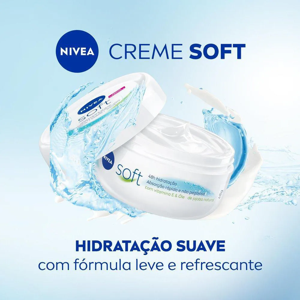 O que é?O NIVEA Soft é um creme hidratante altamente eficaz, desenvolvido para o uso diário em todos os tipos de pele. Ele é conhecido por sua fórmula leve e refrescante, que combina vitamina E e óleo de Jojoba. Esses ingredientes ajudam a nutrir e proteger a pele, oferecendo hidratação suave e duradoura por 48 horas.Para que serve? NIVEA Soft serve para hidratar e suavizar a pele, proporcionando uma sensação de frescor e revitalização. Sua fórmula é rapidamente absorvida pela pele, evitando a sensação de oleosidade. O creme é ideal para quem busca uma hidratação eficaz e ao mesmo tempo leve, podendo ser utilizado no rosto, nas mãos e em todo o corpo. Por ser dermatologicamente testado, é seguro para uso diário, ajudando a manter a pele macia, hidratada e protegida contra o ressecamento ao longo do dia.