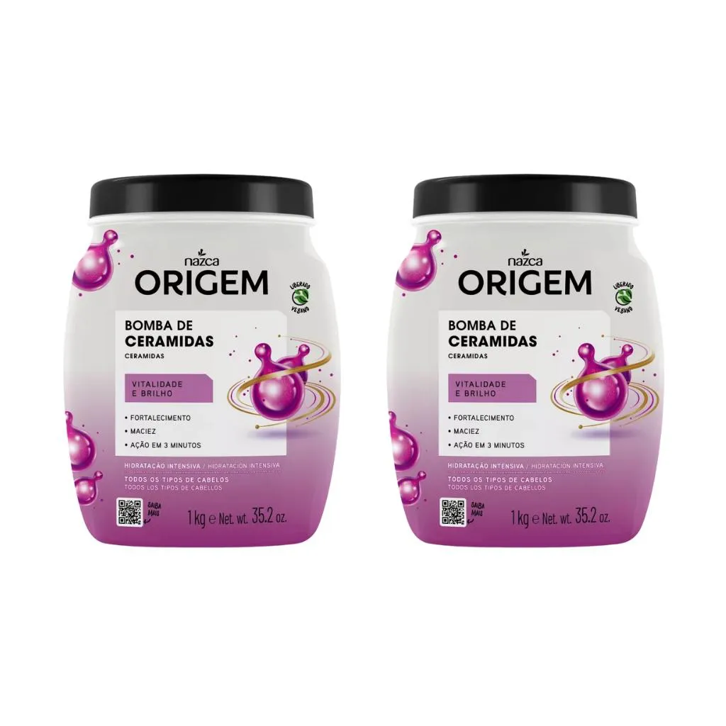 Esse kit contém: 2 Creme Origem 1kg de Hidratacao Bomba de Ceramidas Descrição O Creme Origem de Hidratação Bomba de Ceramidas 1kg foi desenvolvido para oferecer hidratação profunda e reconstrução da fibra capilar, fortalecendo os fios e restaurando sua saúde natural. Enriquecido com ceramidas, que auxiliam na reparação da estrutura interna do cabelo, ele promove maciez, brilho e resistência, mesmo em cabelos danificados ou fragilizados. Sua fórmula potente atua no controle do frizz, na suavização dos fios e no desembaraço fácil, garantindo cabelos alinhados, sedosos e com movimento natural. Ideal para cabelos ressecados, quebradiços ou quimicamente tratados, o produto devolve vitalidade e força aos fios, prevenindo a quebra e pontas duplas. O Origem Hidratação Bomba de Ceramidas transforma a rotina de cuidados em um verdadeiro tratamento nutritivo, proporcionando cabelos hidratados, nutridos, fortes, macios e com brilho saudável, mantendo-os protegidos e revitalizados. Modo de Usar