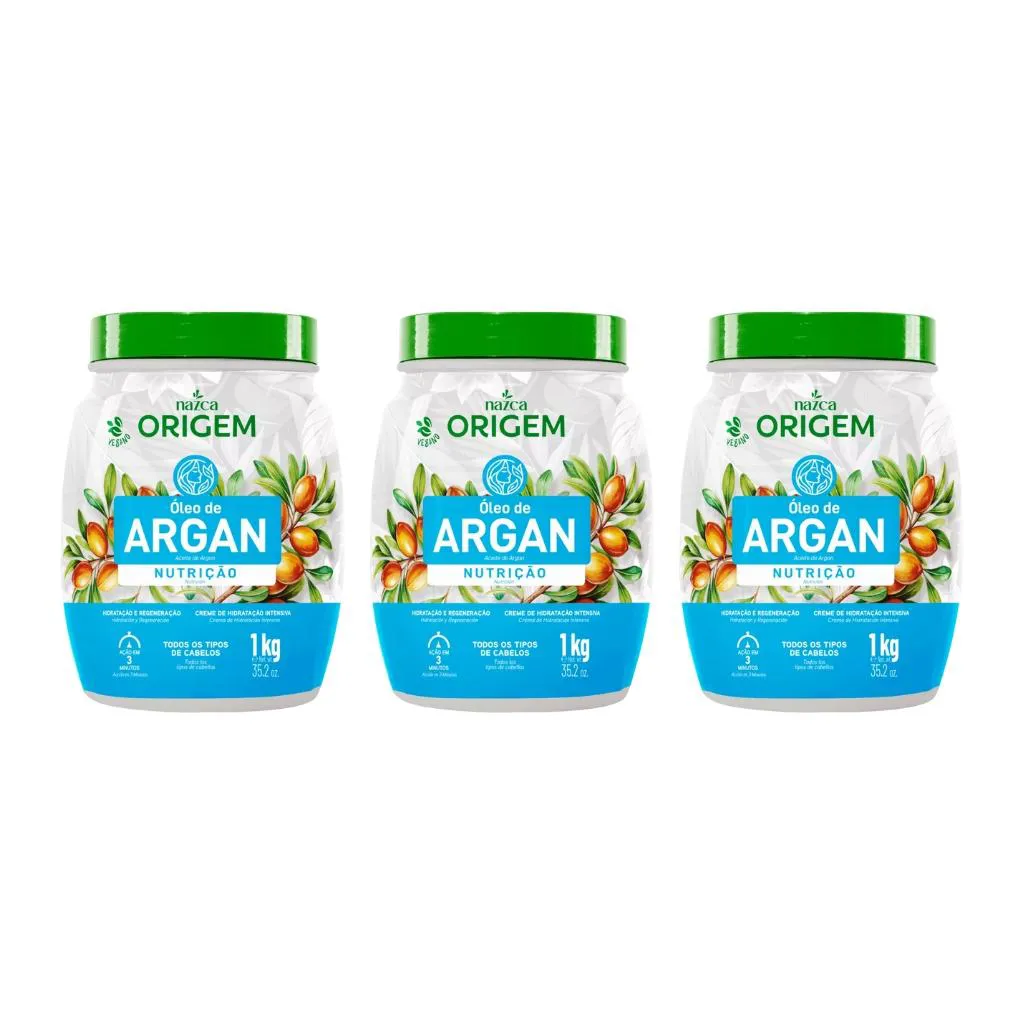 Esse kit contém: 3 Creme Origem 1kg de Hidratacao Oleo de Argan Descrição O Creme Origem de Hidratação Óleo de Argan 1kg foi desenvolvido para oferecer hidratação profunda, nutrição e recuperação dos fios, proporcionando cabelos macios, sedosos e com brilho natural. Enriquecido com óleo de argan, conhecido por suas propriedades antioxidantes e emolientes, ele ajuda a reparar danos, reduzir o frizz e proteger os fios contra agressões externas. Sua fórmula proporciona desembaraço fácil, controle do frizz e toque sedoso, tornando os cabelos mais leves e alinhados. Ideal para cabelos ressecados, quebradiços ou quimicamente tratados, o produto devolve vitalidade, força e saúde aos fios, promovendo uma textura uniforme e aparência naturalmente bonita. Indicado para todos os tipos de cabelo, o Origem Hidratação Óleo de Argan transforma a rotina capilar em um verdadeiro tratamento nutritivo, garantindo fios hidratados, nutridos, macios, fortes e com brilho intenso, prontos para qualquer ocasião. Modo de Usar Como Creme de Hidratação: