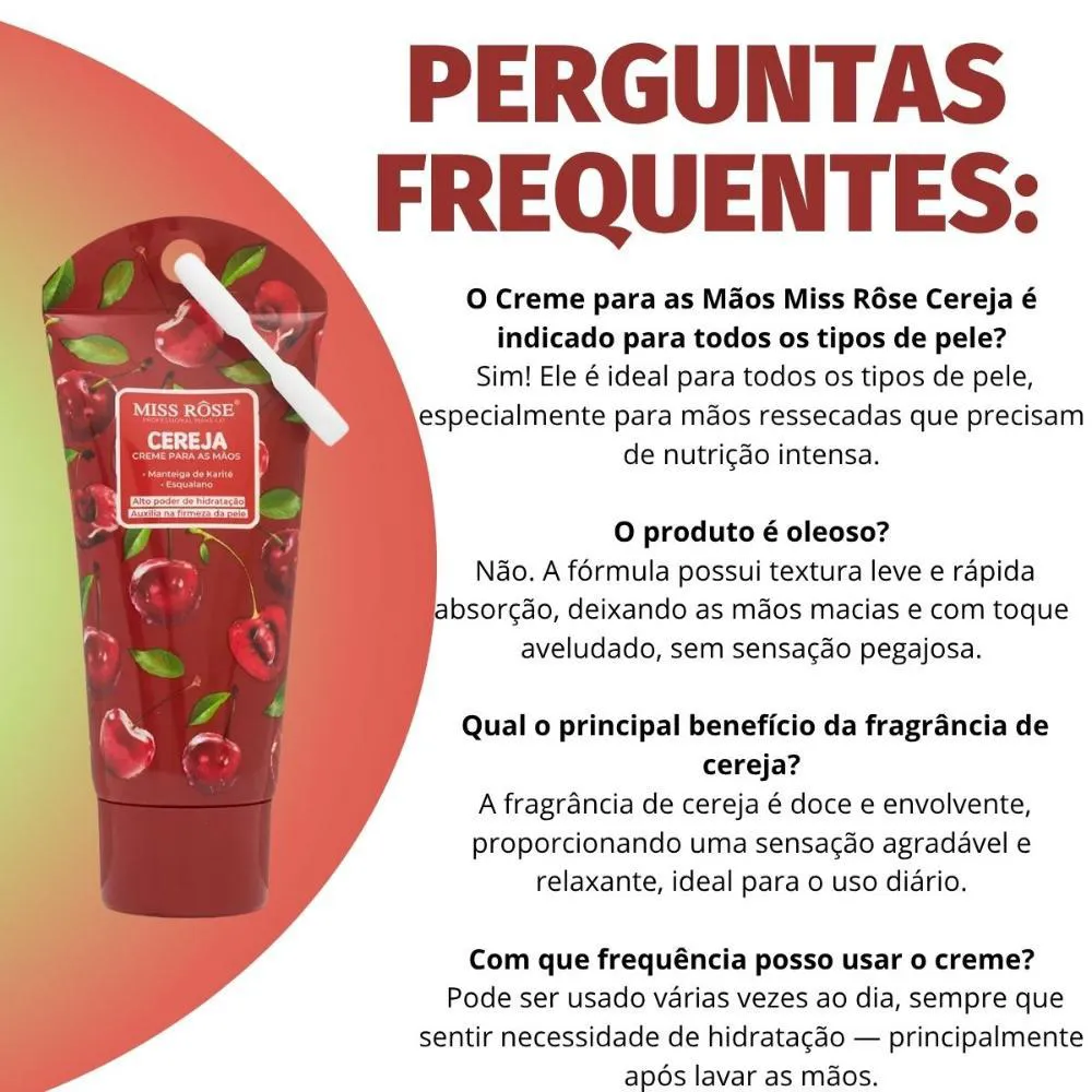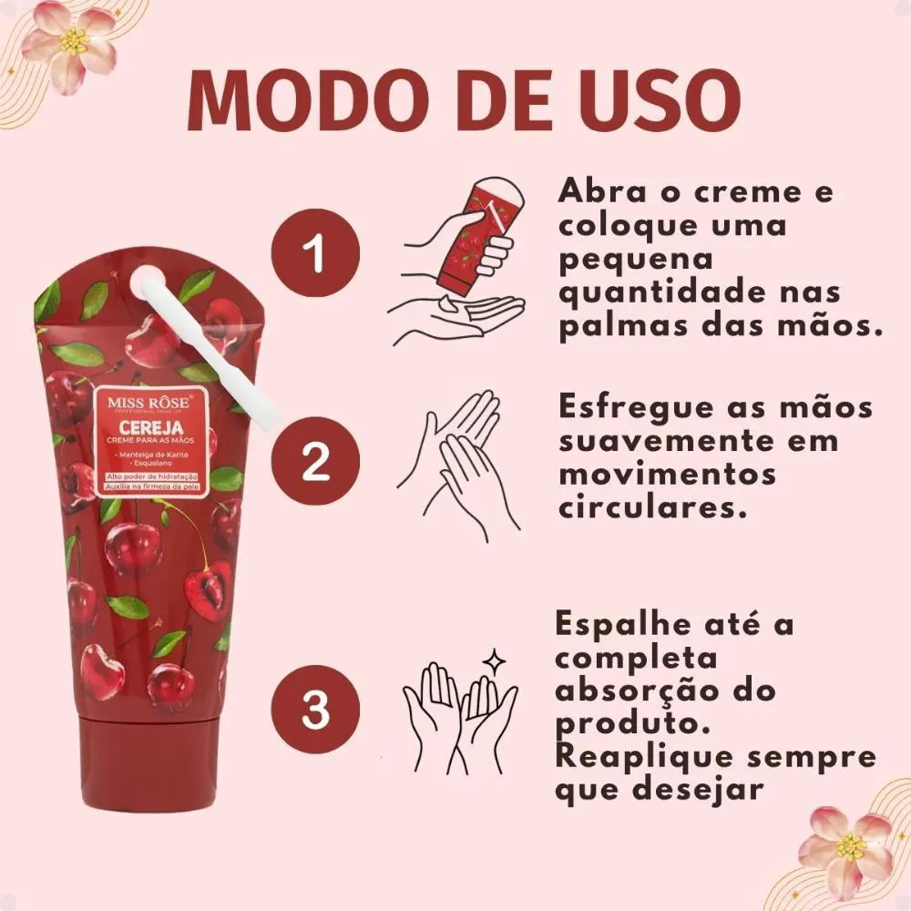 Hidratação profunda para mãos ressecadas.Mãos visivelmente mais suaves e macias ao toque.Fragrância agradável e duradoura de cereja.