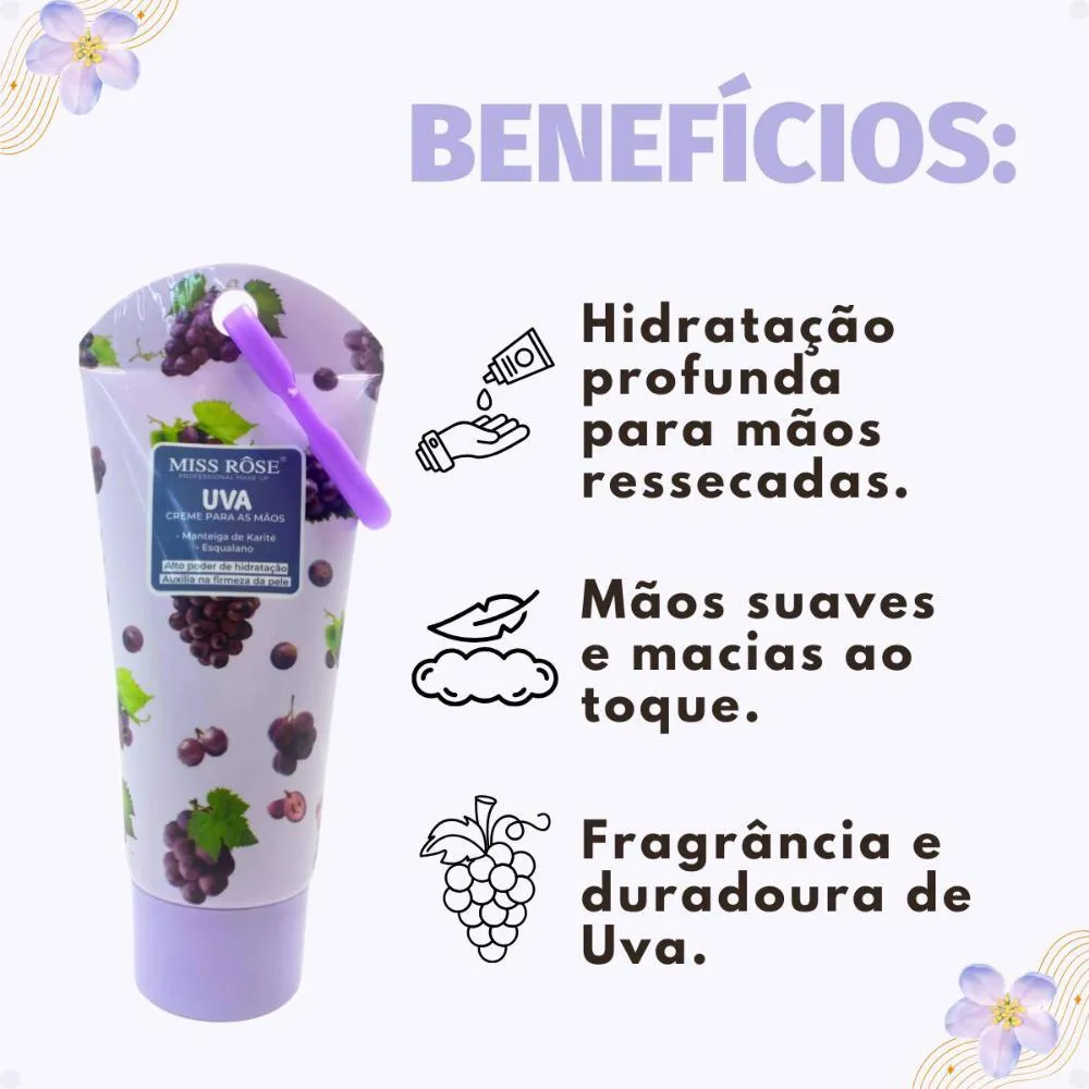 Descubra o prazer de mãos macias e perfumadas com o Creme Para As Mãos Miss Rôse Uva 60ml. Desenvolvido para proporcionar hidratação intensa e um toque suave, este creme é a solução perfeita para o cuidado diário das suas mãos. Sua fórmula exclusiva, enriquecida com a deliciosa fragrância de Uva, transforma a rotina de hidratação em um momento de puro bem-estar. Ideal para quem busca praticidade e cuidado, este creme é perfeito para levar na bolsa e usar a qualquer hora do dia, proporcionando hidratação e um aroma irresistível.Benefícios Principais