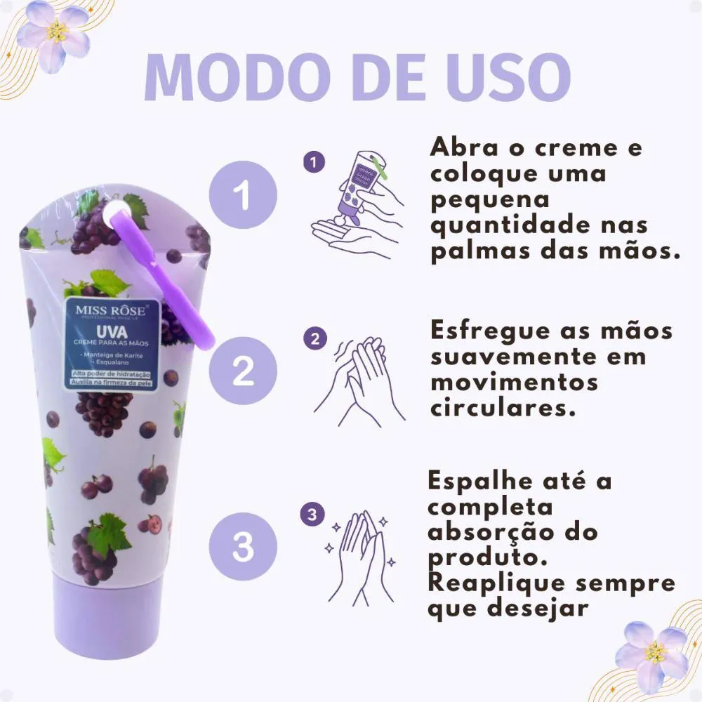 Aplique uma pequena quantidade do Creme Para As Mãos Miss Rôse uva nas mãos. Massageie suavemente até que o produto seja completamente absorvido pela pele. Reaplique sempre que sentir necessidade de hidratação.Anvisa: 25351.236854/2024-59