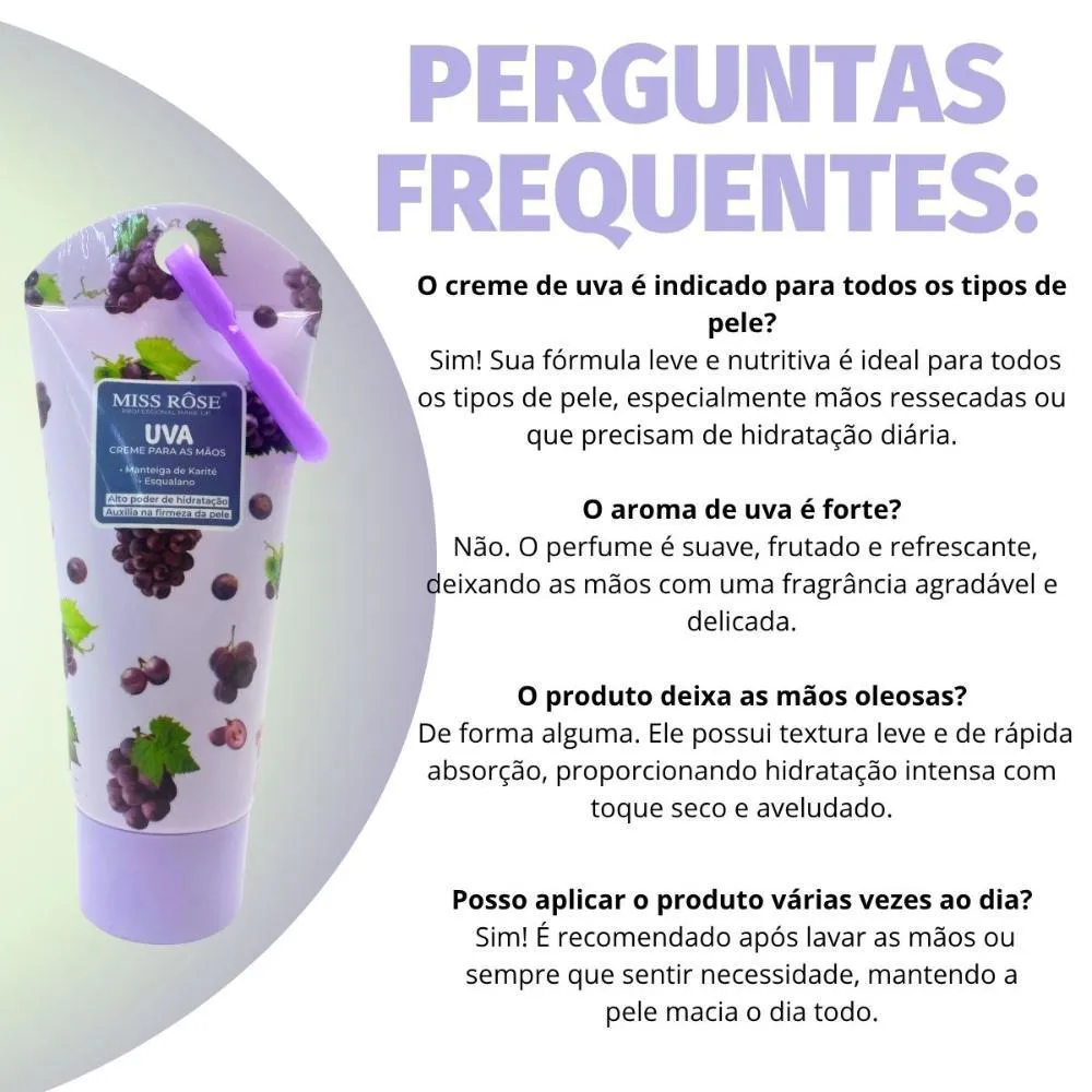 Hidratação profunda para mãos ressecadas. Mãos visivelmente mais suaves e macias ao toque. Fragrância agradável e duradoura de uva.Diferenciais do Produto