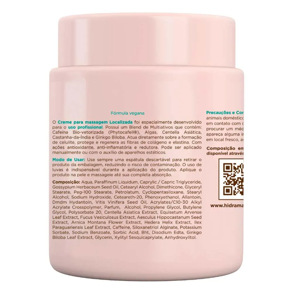 O Creme Para Massagem Localizada com Phytocafeil Hidramais é indicado para tratamentos anti-celulite e queima de gordura localizada, previne formação de adiposidades; drena superficialmente os líquidos retidos. Sua fórmula é rico em ativos naturais: Óleo de Semente de Uva, Óleo de algodão, Extrato de Centelha Asiática, Ginko Biloba, Arnica, Castanha da Índia e Algas. Sugestão de Aplicação: Aplique o produto sobre a pele, e massageia até completa absorção.