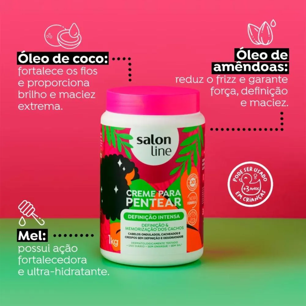 O creme de pentear Salon Line Definição Intensa é um produto capilar desenvolvido especialmente para cachos e cabelos crespos, com uma fórmula nutritiva composta por óleo de coco, óleo de amêndoas e mel. Possui textura leve e cremosa, sendo um produto vegano e livre de ingredientes como sulfato, petrolato, parafina e óleo mineral.