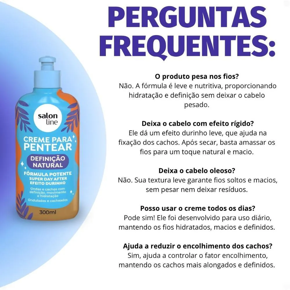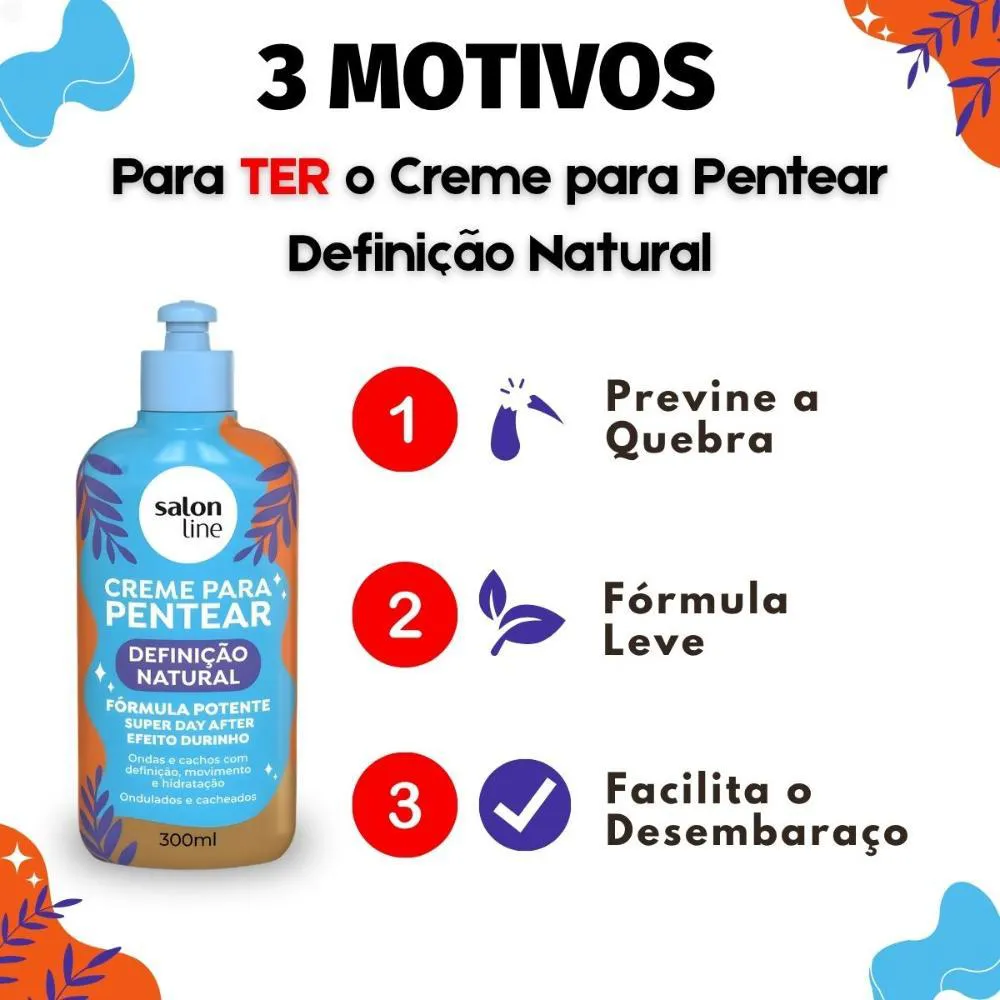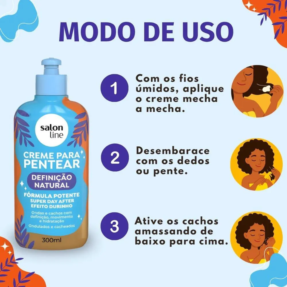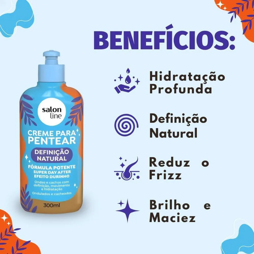 O Creme Para Pentear Salon Line Definição Natural 300ml é perfeito para a finalização de todos os tipos de cabelo, ideal para uso diário. É a escolha certa para quem busca praticidade e resultados de salão em casa, garantindo cachos e ondas definidos e saudáveis em qualquer ocasião.Modo de Uso/Aplicação