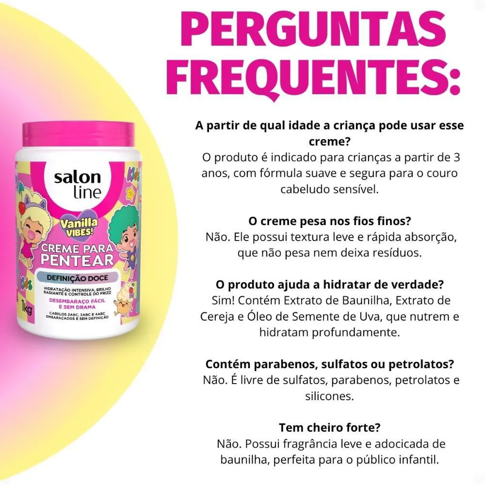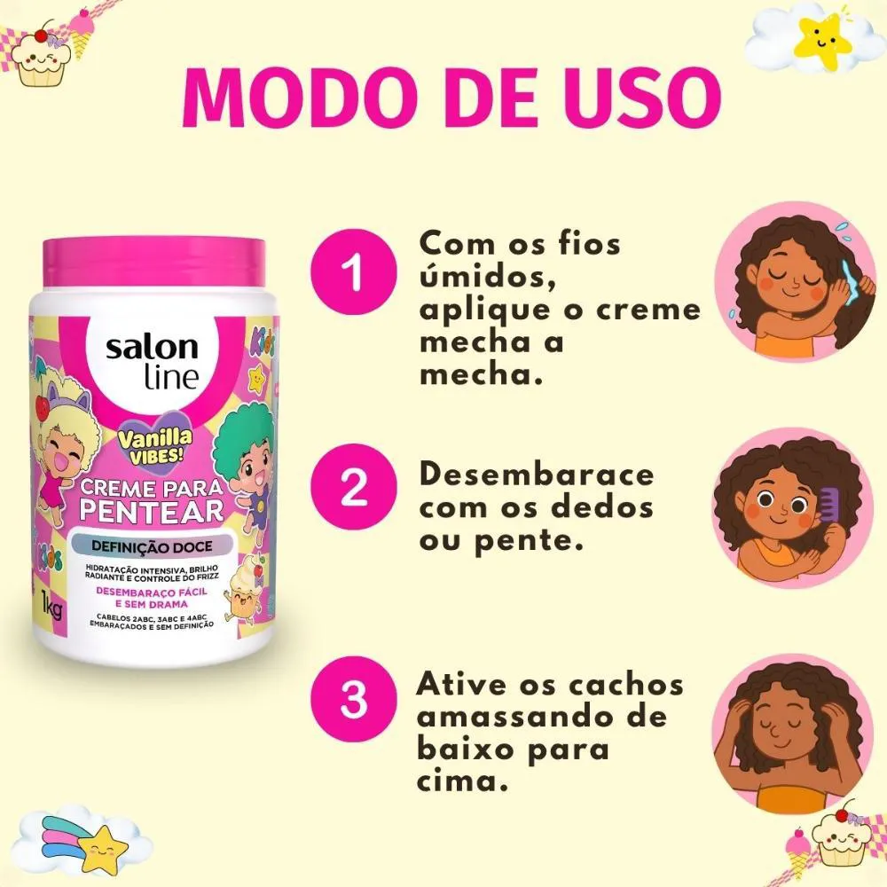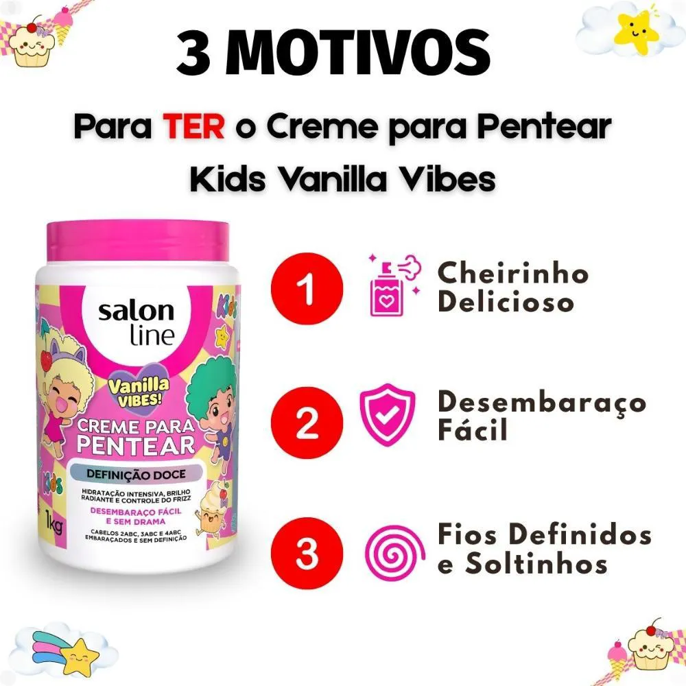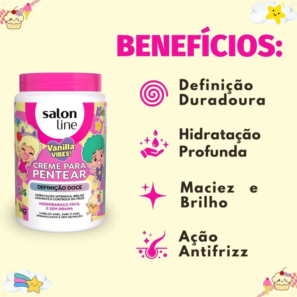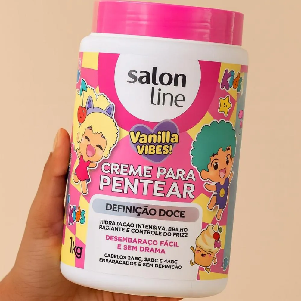 Descubra o segredo para cachos perfeitamente definidos e cheios de vida com o Creme Para Pentear Salon Line Kids Vanilla Vibes! Definição Doce 1kg. Especialmente formulado para atender às necessidades dos cabelos cacheados 2ABC, 3ABC e 4ABC, este creme é a solução ideal para quem busca definição, hidratação intensa e um desembaraço suave. Com uma fragrância deliciosa de baunilha, ele transforma a rotina de cuidados capilares em um momento de puro prazer, garantindo cachos macios, brilhantes e com balanço natural.O Creme Para Pentear Salon Line Kids Vanilla Vibes! Definição Doce 1kg foi desenvolvido pensando na delicadeza dos cabelos, inclusive os infantis, proporcionando um tratamento completo que nutre e protege os fios. Diga adeus aos nós e olá a cachos deslumbrantes, com uma definição duradoura e um toque irresistível.Benefícios Principais