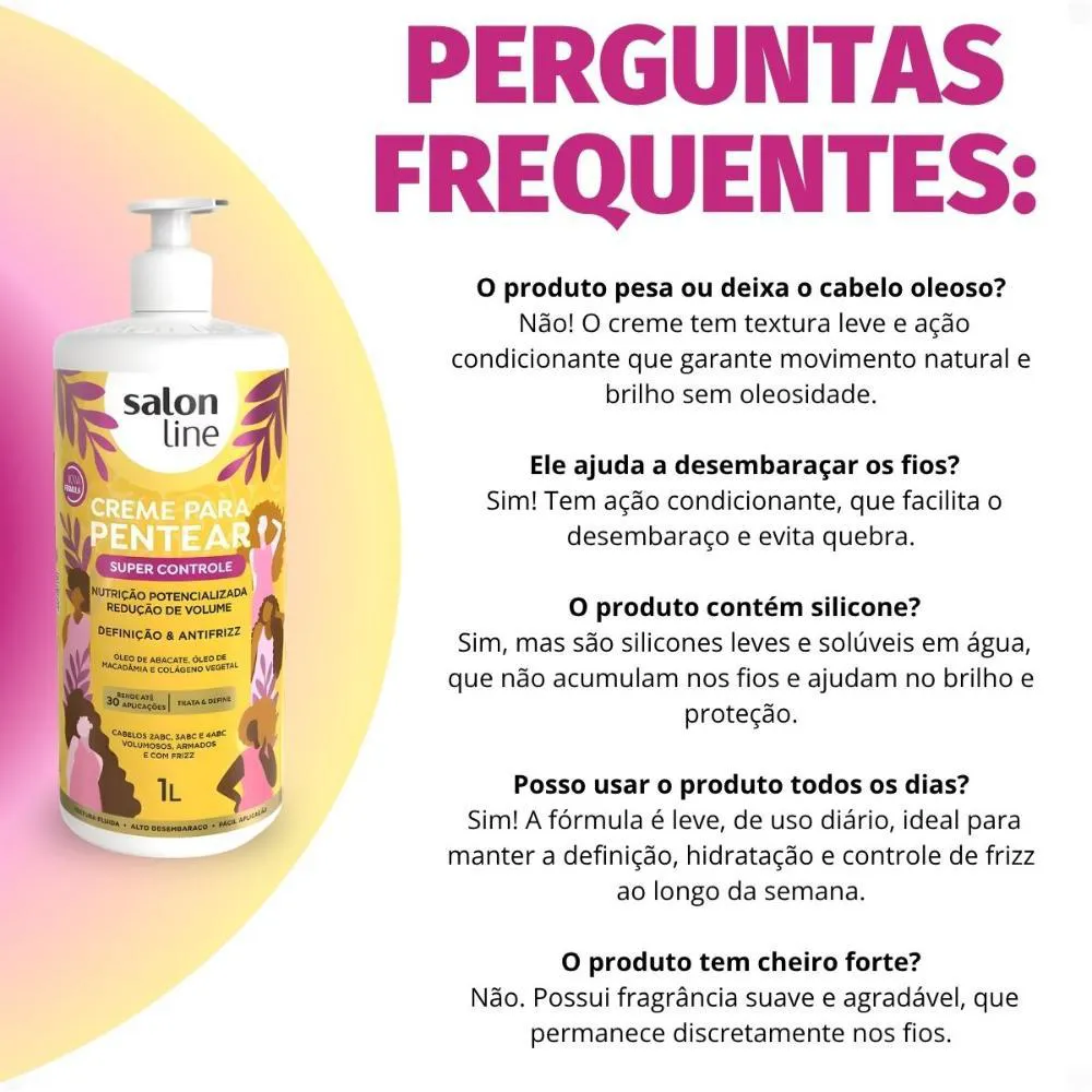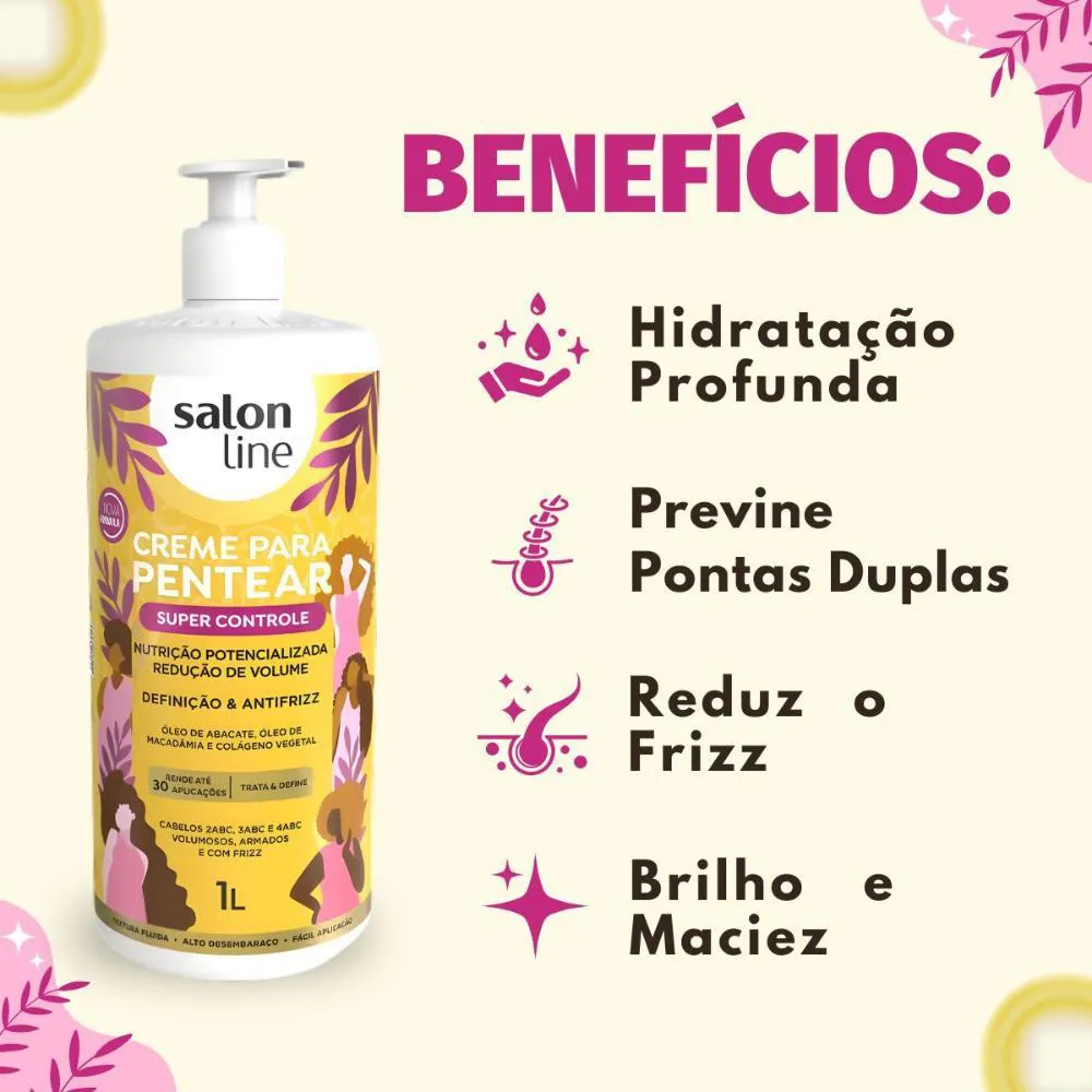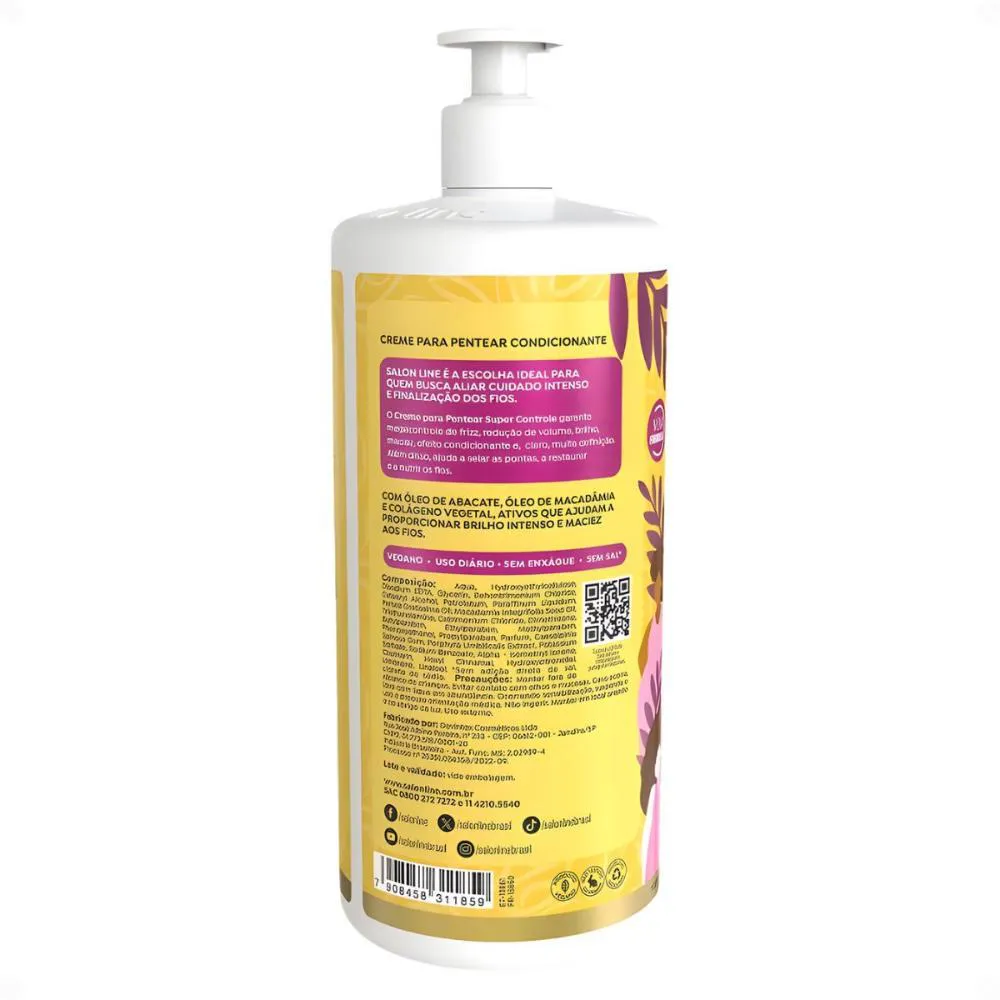 O Creme Para Pentear Salon Line Super Controle 1L é um produto capilar desenvolvido especificamente para cabelos ondulados, cacheados e crespos, com uma fórmula avançada enriquecida com óleo de abacate, óleo de macadâmia e colágeno vegetal. Trata-se de um creme de pentear vegano que oferece cuidado especializado para os fios.