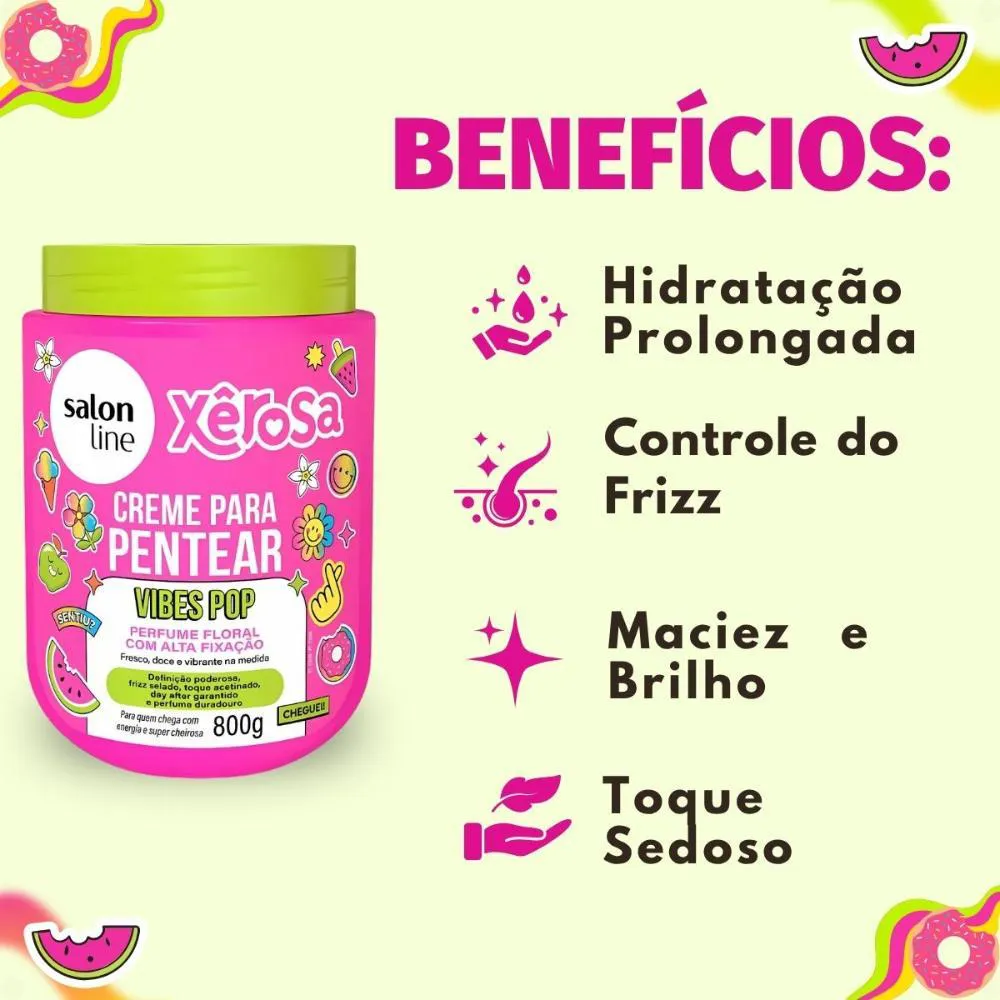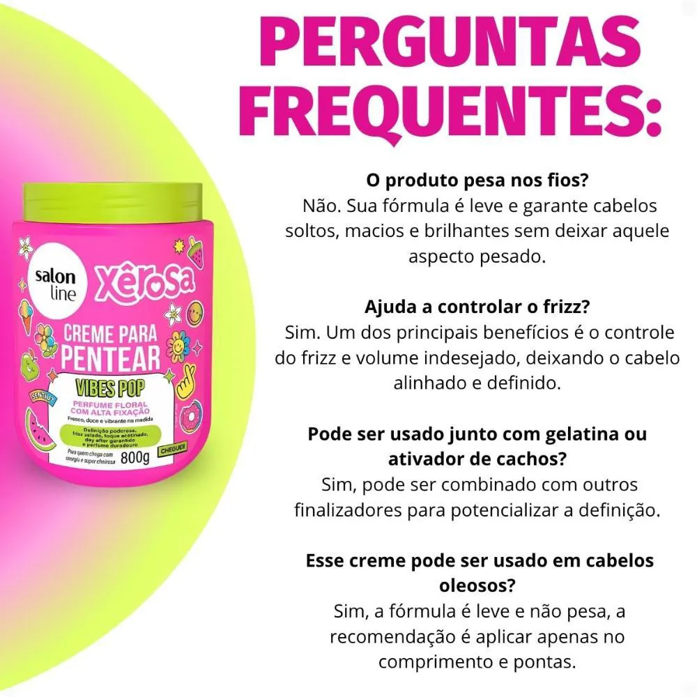 Fórmula exclusiva Salon Line, sinônimo de qualidade e inovação.Linha Xêrosa Vibes Pop, que oferece uma experiência sensorial única.Embalagem de 800g, garantindo excelente custo-benefício e longa duração.Produto desenvolvido para atender às necessidades de diversos tipos de cabelo.Ocasiões de Uso/Cenários Ideais