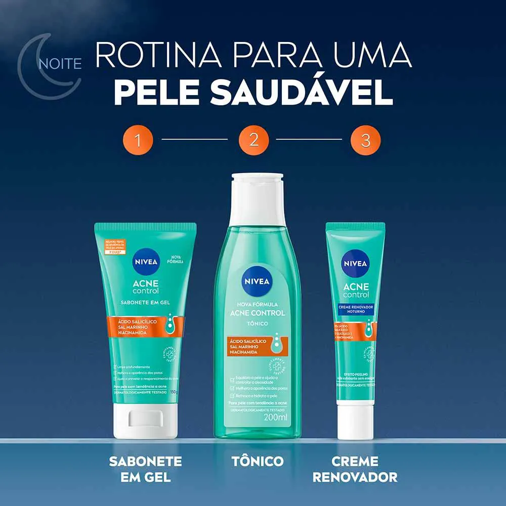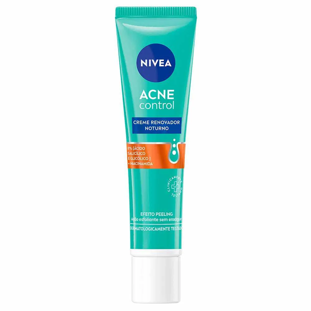 O NIVEA Creme Renovador Noturno Acne Control foi desenvolvido para peles com tendência à acne, proporcionando renovação e cuidado noturno. Sua fórmula avançada combina 8% de ácidos (salicílico e glicólico) com niacinamida, promovendo um efeito peeling enquanto suaviza a pele.