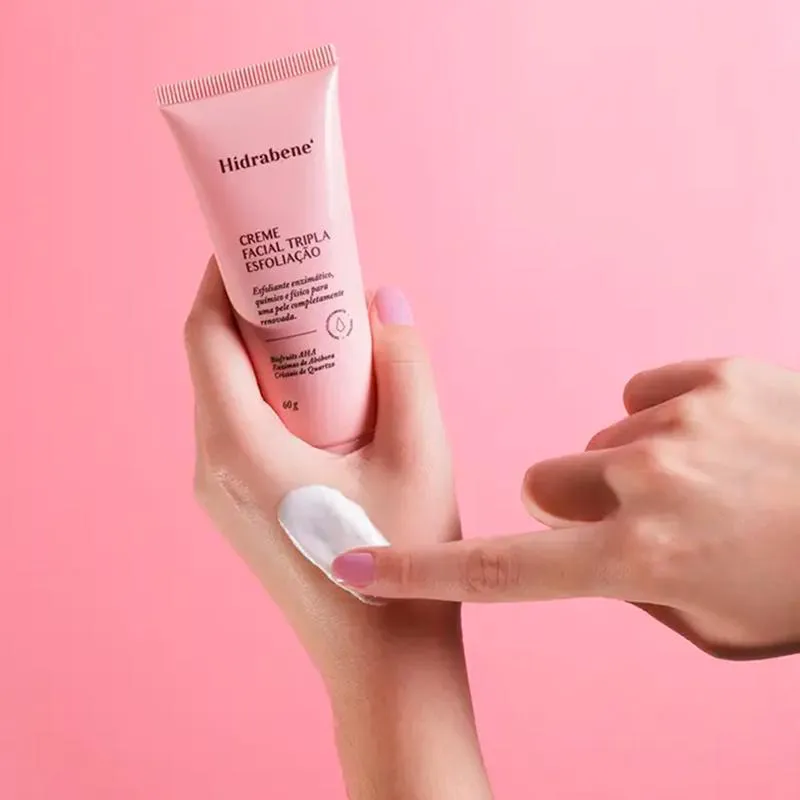 [INF] Aplique o creme Hidrabene Facial Tripla Esfoliação na pele úmida, faça movimentos circulares, evite áreas sensíveis, enxague e hidrate a pele.