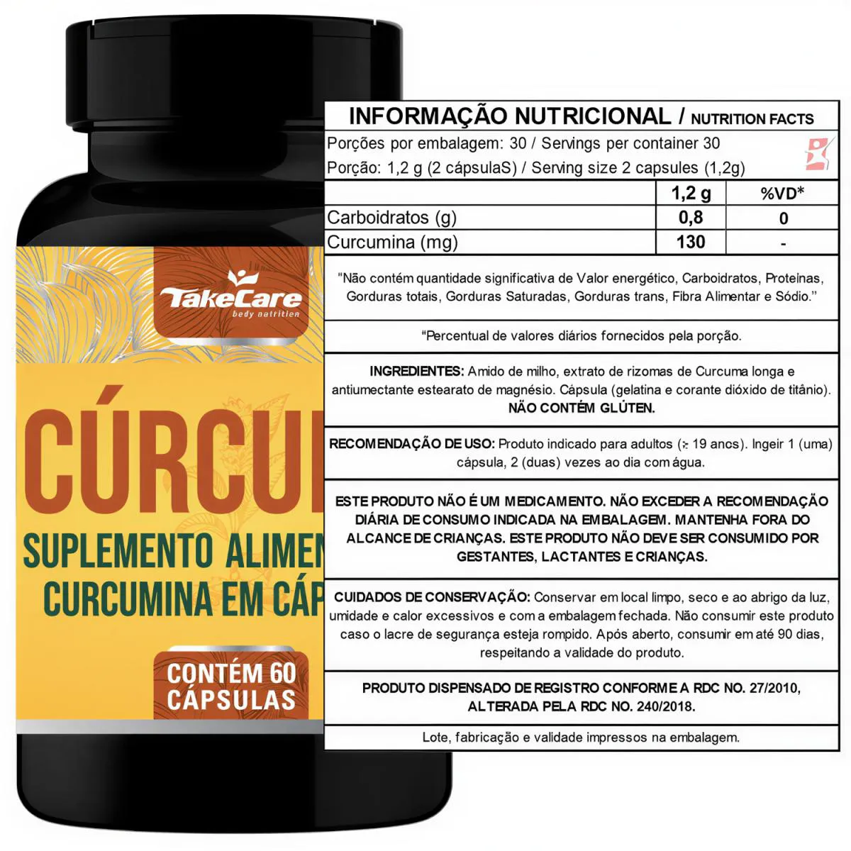 Cúrcuma 130Mg de Curcumina na Porção 60 Cápsulas – Take Care