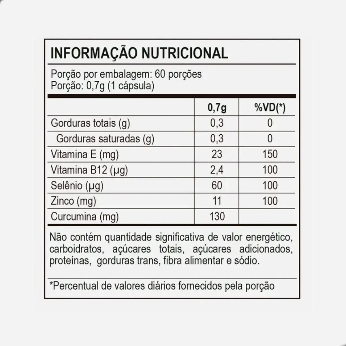 Sua composição extrato de cúrcuma padronizado em curcuminoides encapsulado em cápsulas vegetais; sem corantes artificiais. e não inclui componentes de origem animal ou alergênicos comuns, adaptando-se a diferentes estilos de vida.