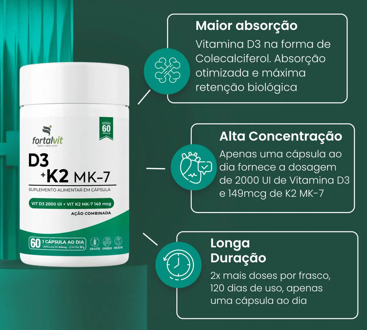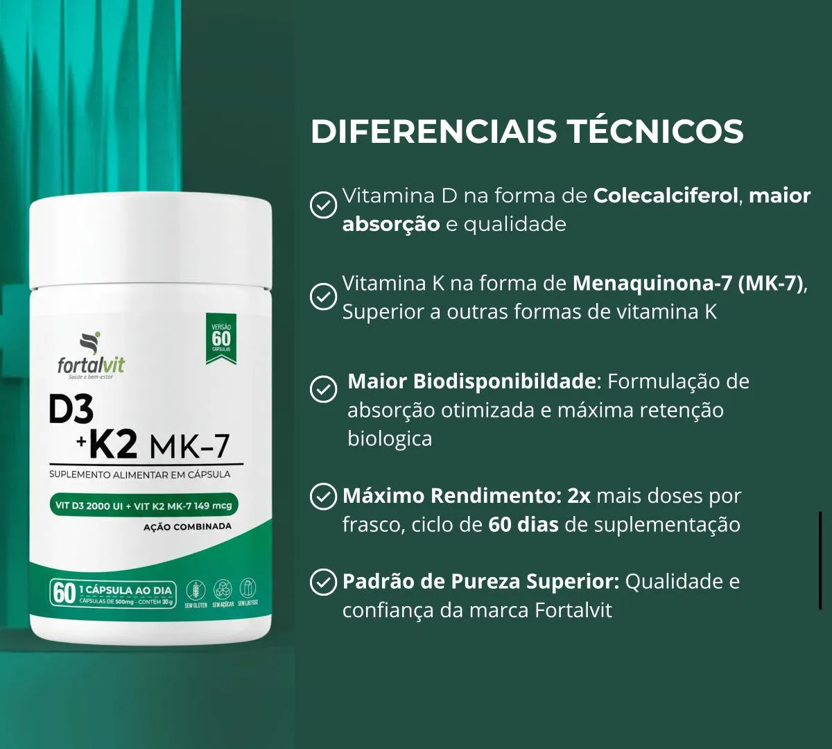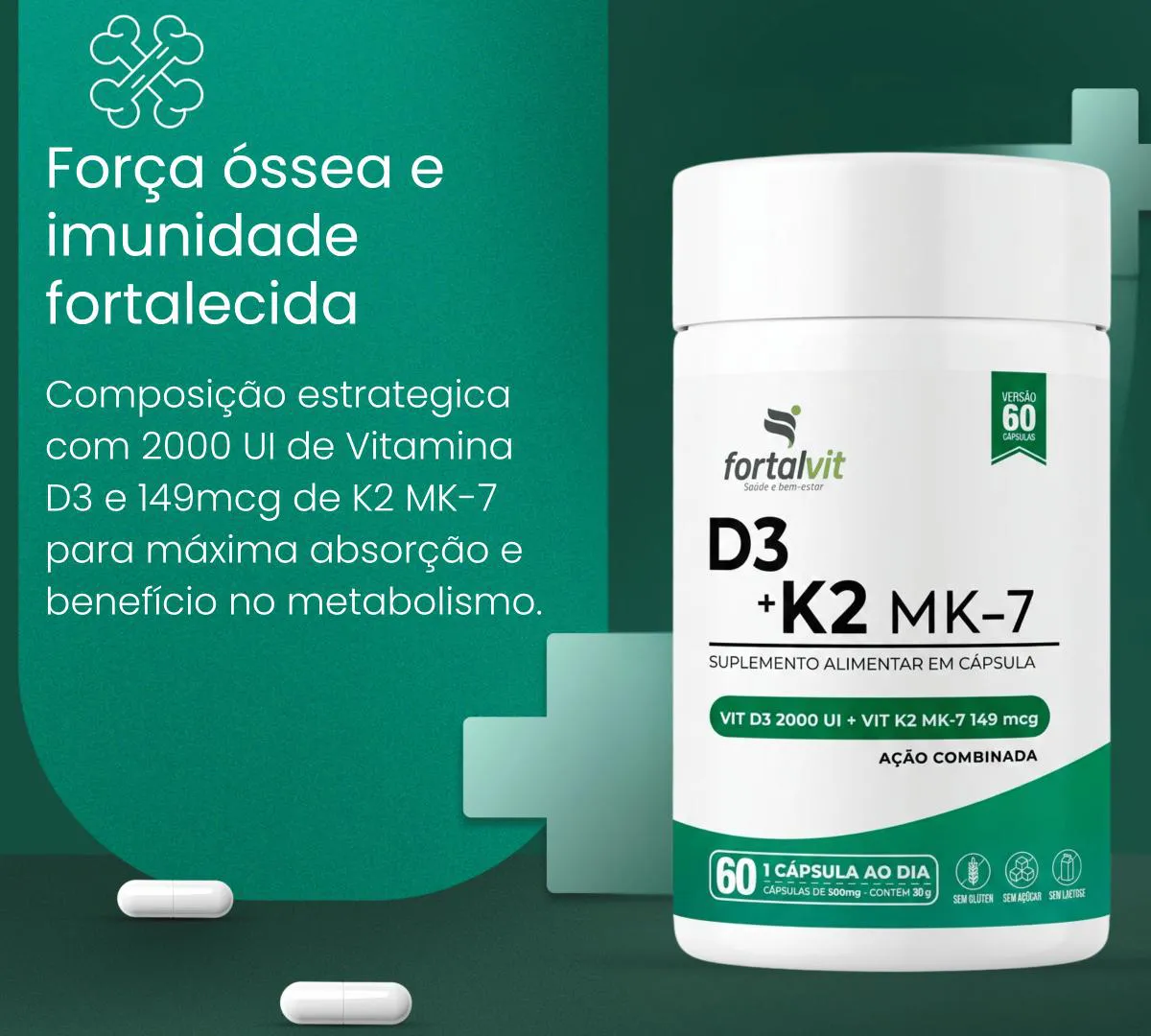 vitamina D3 2000UI + K2 MK7 60 Cápsulas, 2 Meses Uso, Ação Combinada, Fortalvit