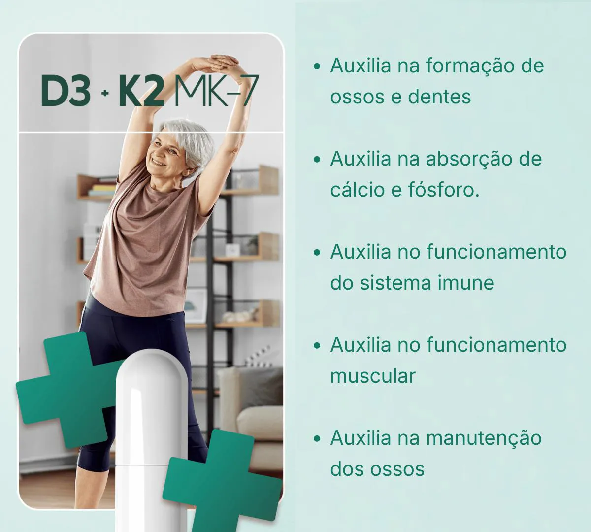 A combinação dessas vitaminas pode ajudar a reduzir o risco de osteoporose e fraturas ósseas, especialmente em idosos
