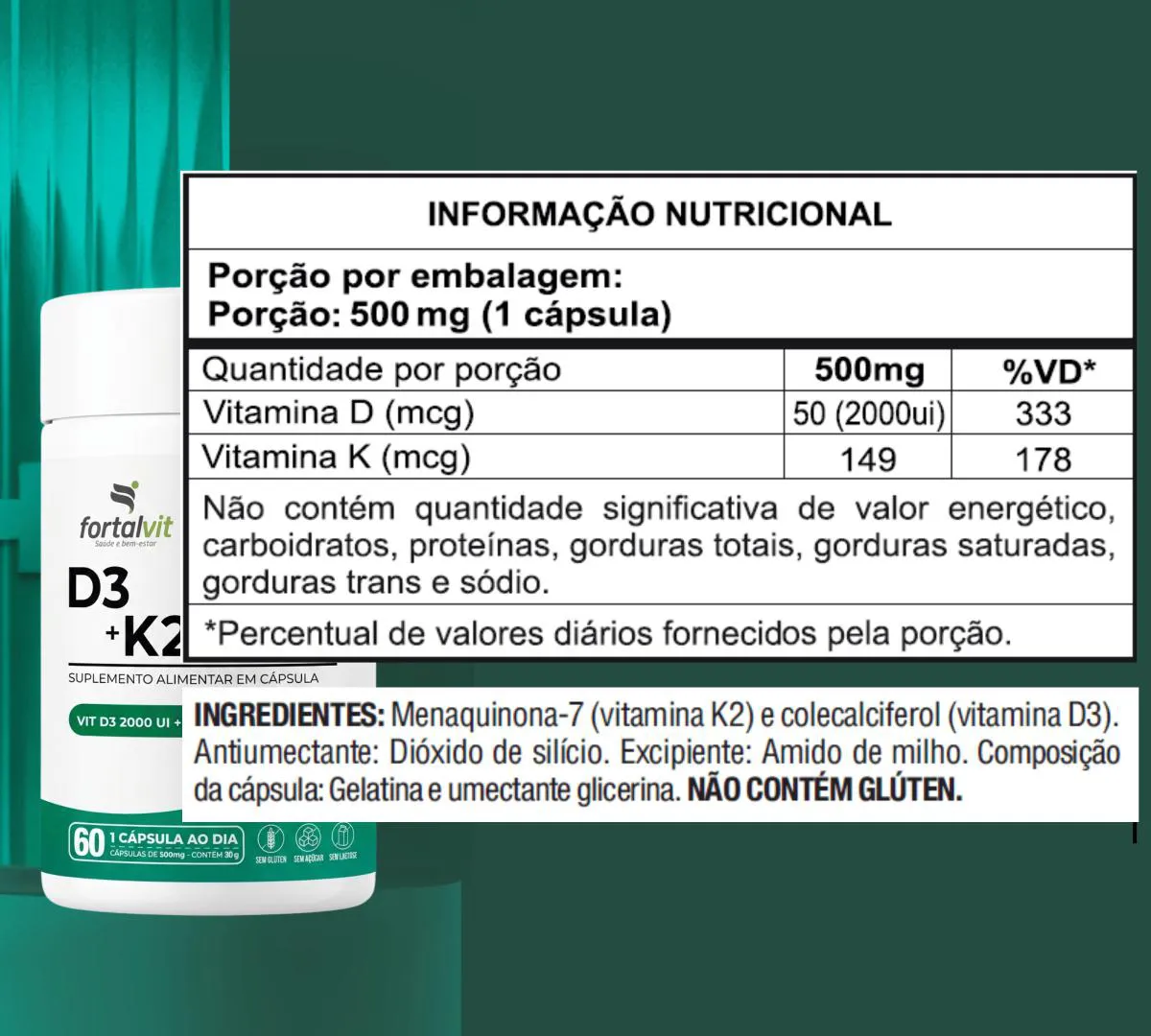 - Contém 2000 UI de Vitamina D3 + Vitamina K2 MK7 (Menaquinona-7) 178% VD.