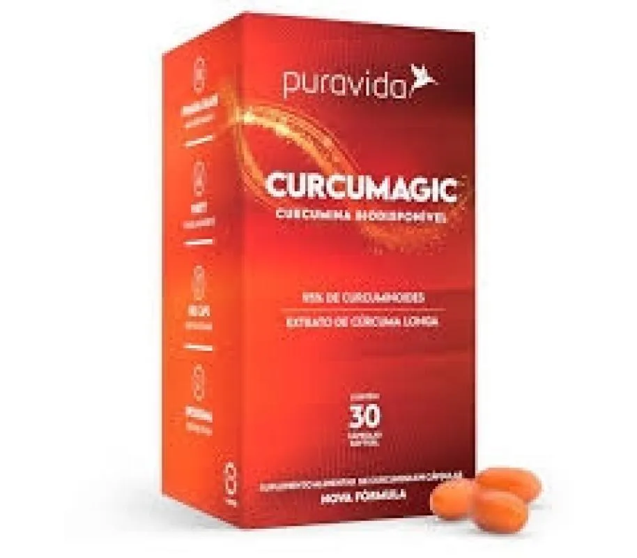 Curcumagic - 95% de Curcuminóides, 100% de Qualidade PuravidaAgora, as cápsulas do Curcumagic são menores, mas mantêm 95% de curcuminóides, garantindo a mesma qualidade e quantidade de curcumina para sua saúde. A cúrcuma longa, raiz com a curcumina, é amplamente estudada por suas propriedades benéficas, com mais de 5.600 estudos científicos comprovando seus efeitos positivos. Tradição e CiênciaOriginária da Ásia, a cúrcuma é um pilar na medicina ayurveda e na medicina tradicional chinesa. A ciência moderna valida esses usos milenares com evidências consistentes dos benefícios da curcumina. Tecnologia Avançada no CurcumagicCada cápsula contém 130 mg de curcumina biodisponível, equivalente a uma colher de sopa de cúrcuma em pó. A tecnologia de lipossomas e TCM garante melhor absorção e eficácia, sem o gosto característico da cúrcuma.Com Curcumagic, você obtém doses concentradas e eficazes de curcumina, de forma prática e sem preocupações com variações na concentração. Curcumagic - A Qualidade Puravida para Sua Saúde.